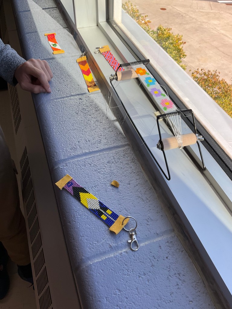 We’ve finished up most of the beading, and now we are weaving in ends and gluing the hide to each side of our work.