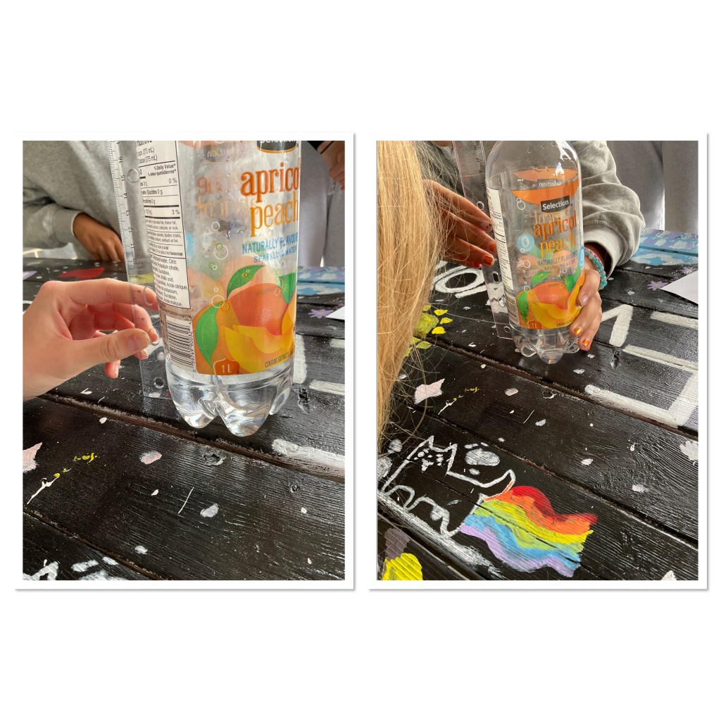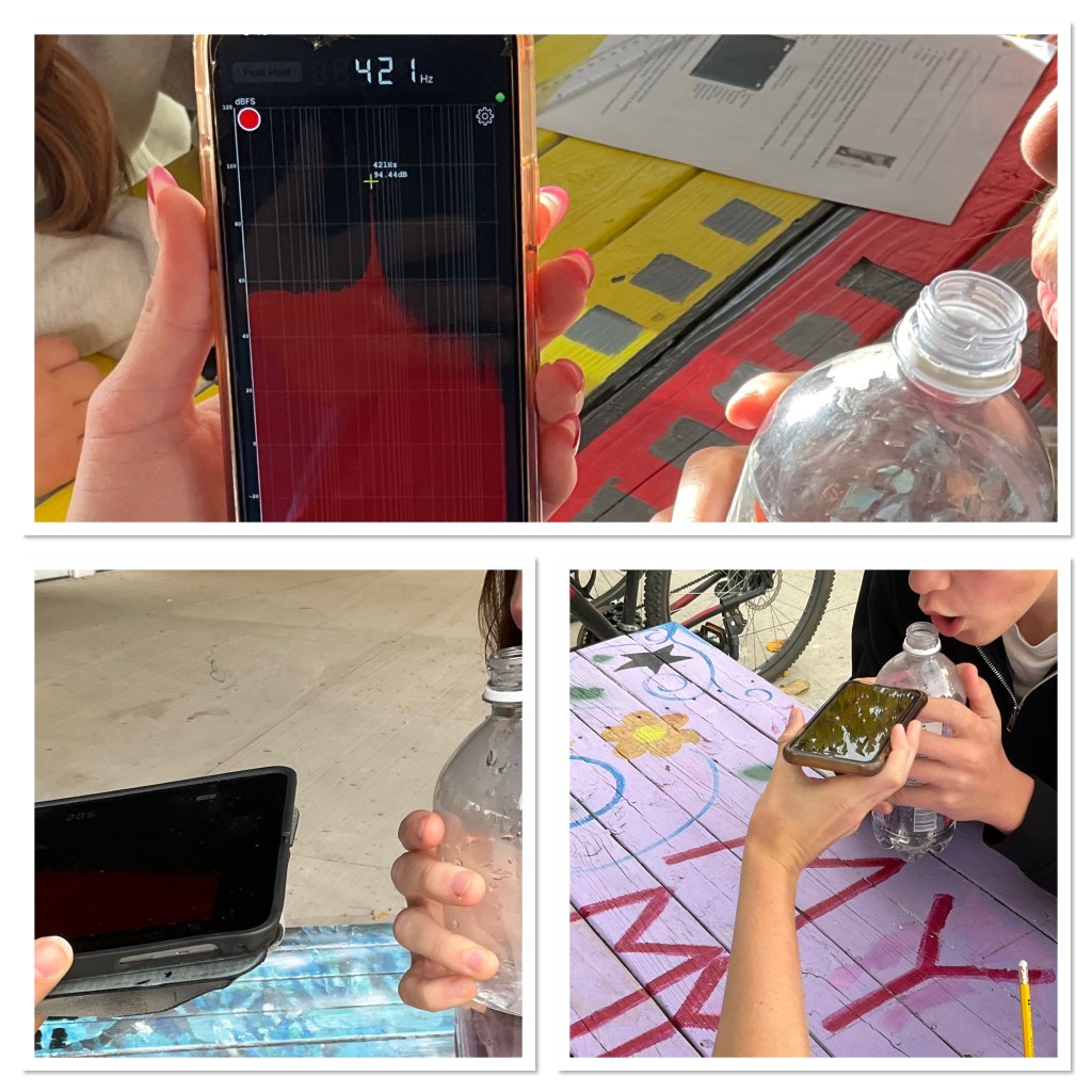 Each group needed the “sonic tools” app (free!) a bottle full of water and a ruler. They empty the bottle until they can blow over the neck and make it resonate. They record the frequency produced, and measure the height of the water in the bottle.