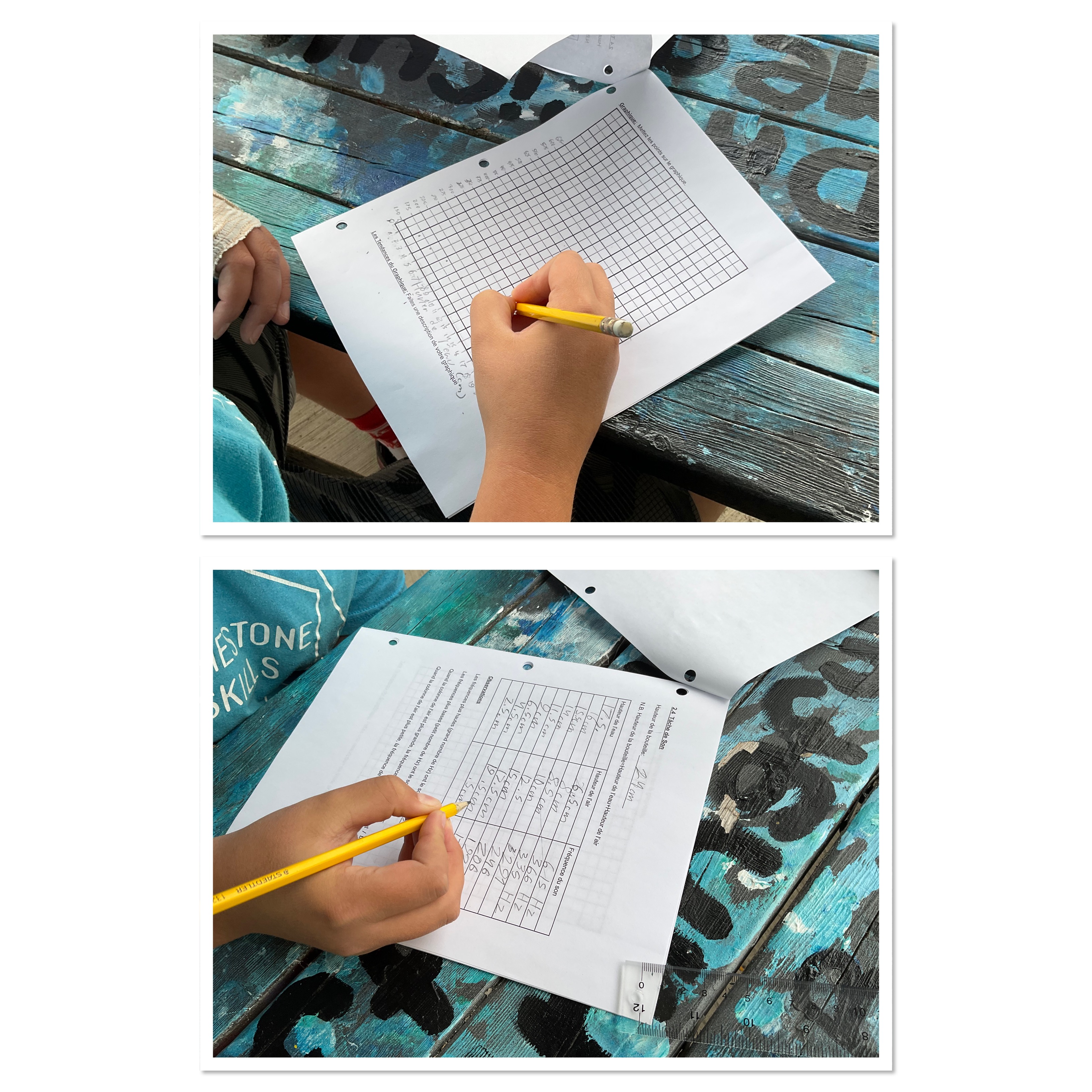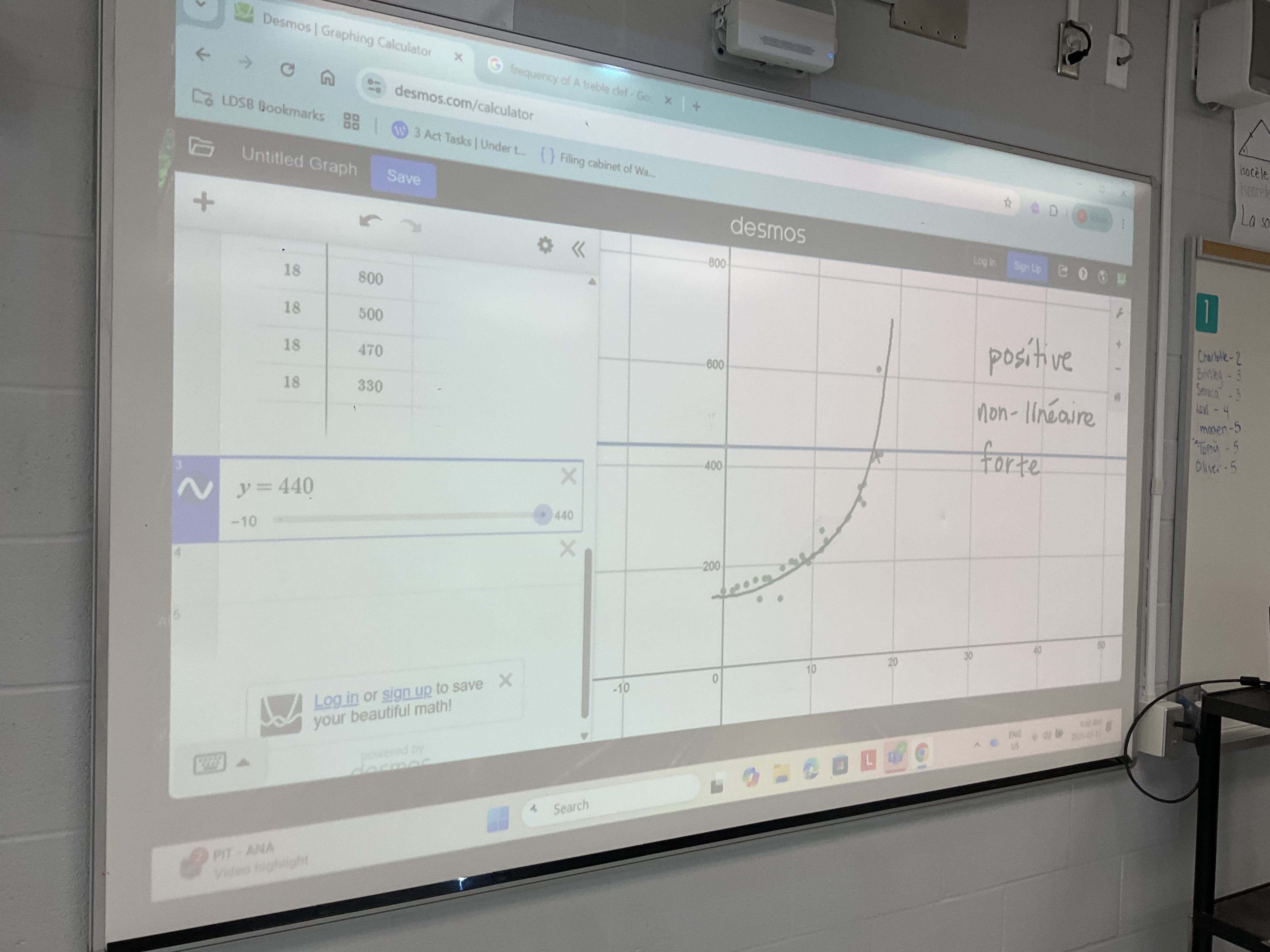We worked outside because it was nice out, and we could spread the groups apart a bit and we could empty the bottles on the flowers. When the class came back inside we put the data together into a big table, and graphed it on desmos. We graphed water height and frequency, and found a pretty strong positive non-linear correlation.