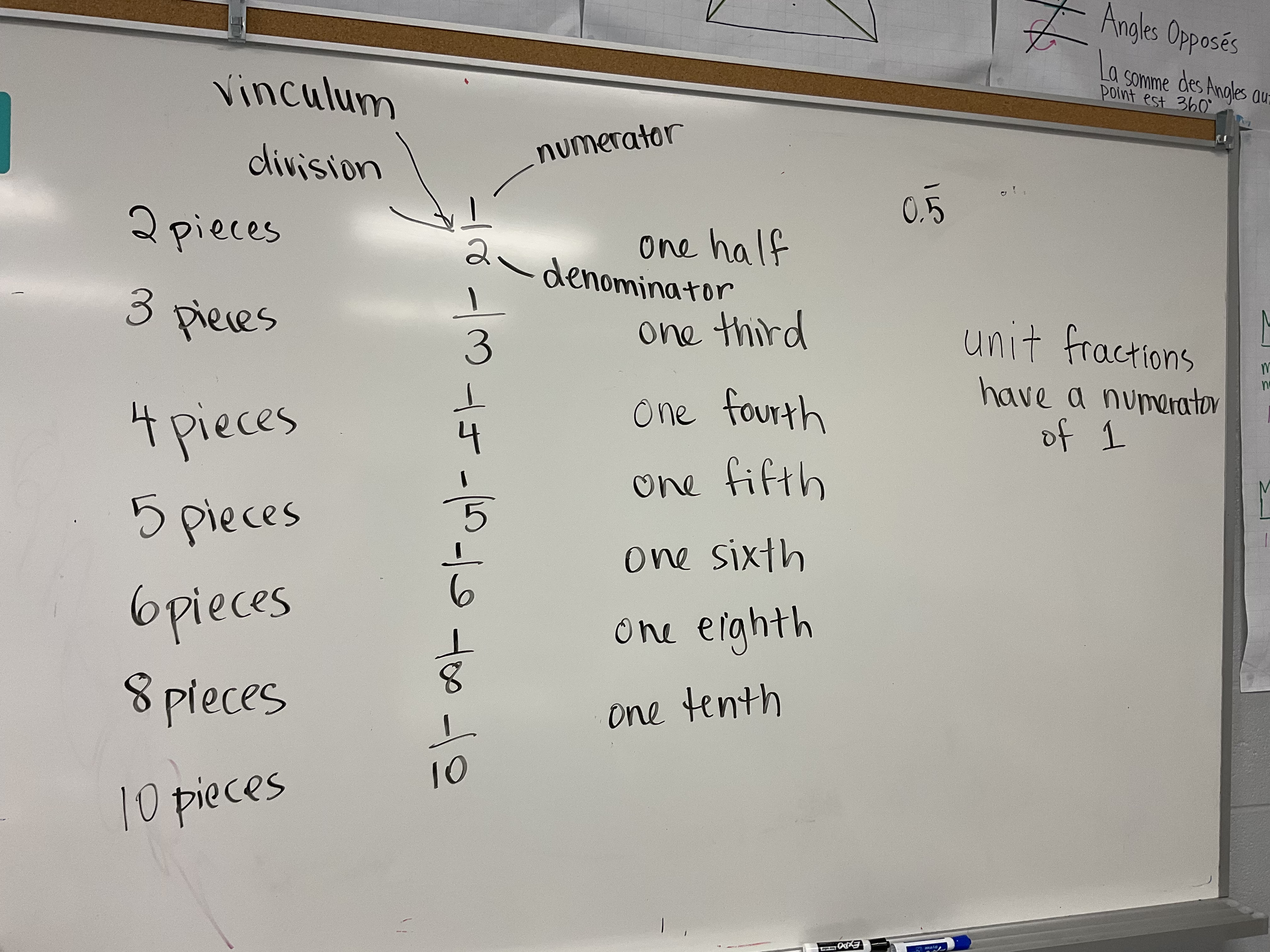 We looked at vocabulary related to fractions and remembered words like numerator and denominator. We remembered that fractions are like division. We also learned a new word that the line between numerator and denominator is called a vinculum. A vinculum is also the little line used over a repeating decimal.