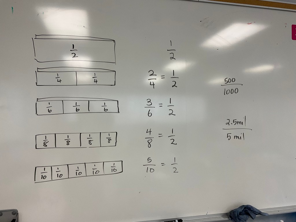 we noticed that these fractions that are equivalent to one half have numerators that are half of the denominator, or denominators that are double the numerator. We even made some equivalent fractions that used really big numbers like 500/1000=1/2.