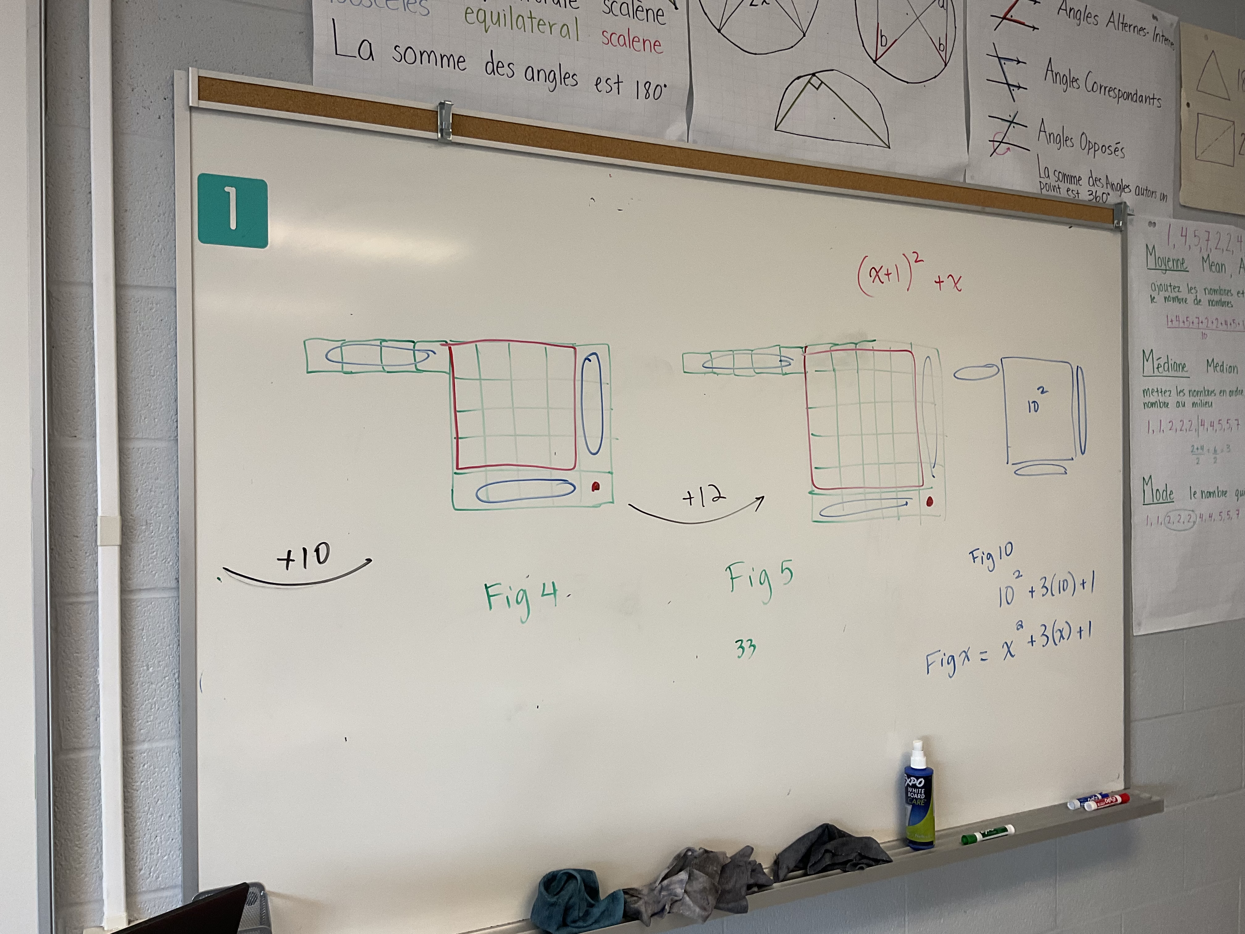 we explored the growth in a few ways. We can see it as a big square (the green square) which is always one bigger than the figure number…or (x+1)^2. Plus we need one group of the figure number. Y=(x+1)^2+x.