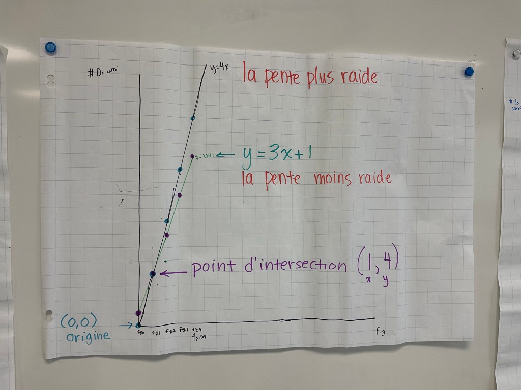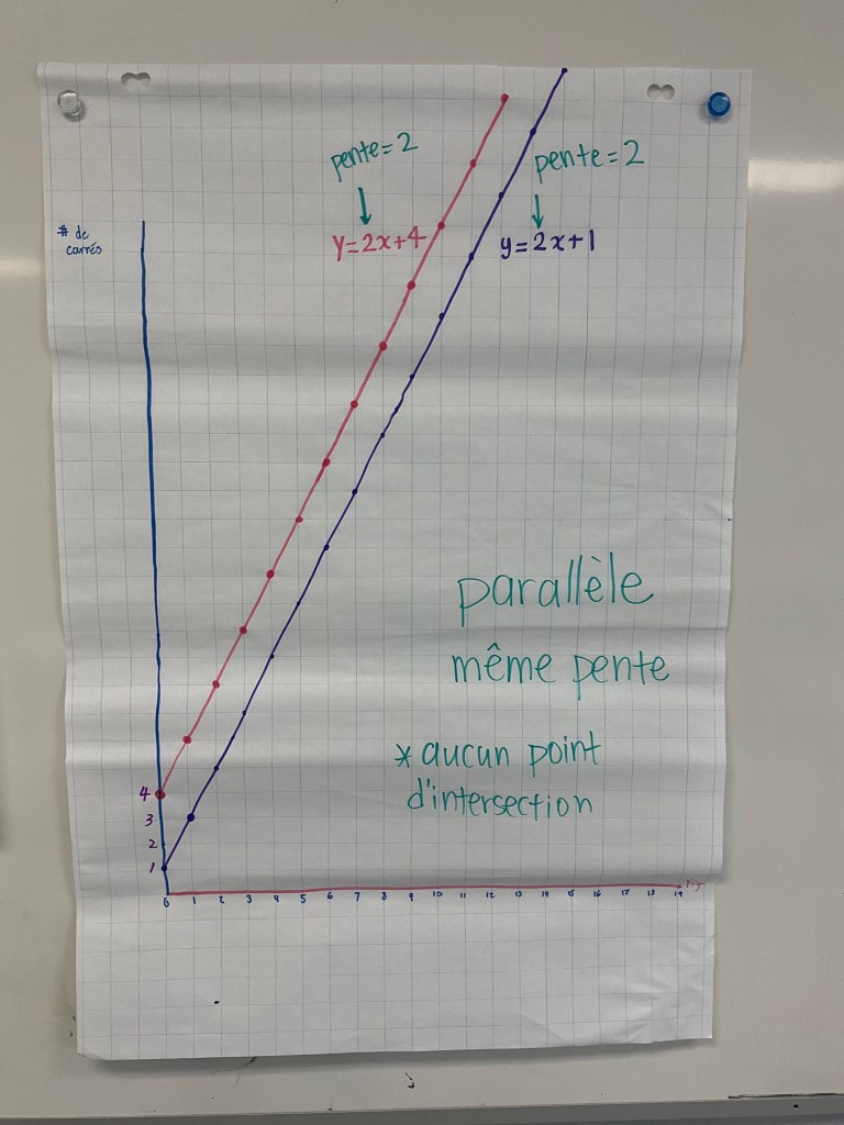 We identified parallel lines, how they have the same slope and will never intersect. We noticed that the slope is the number in front of the x, that multiplies the x. That’s also the rate of change. In French, le taux, la pente. We noticed that the constant will give us the y intercept on our graph.
