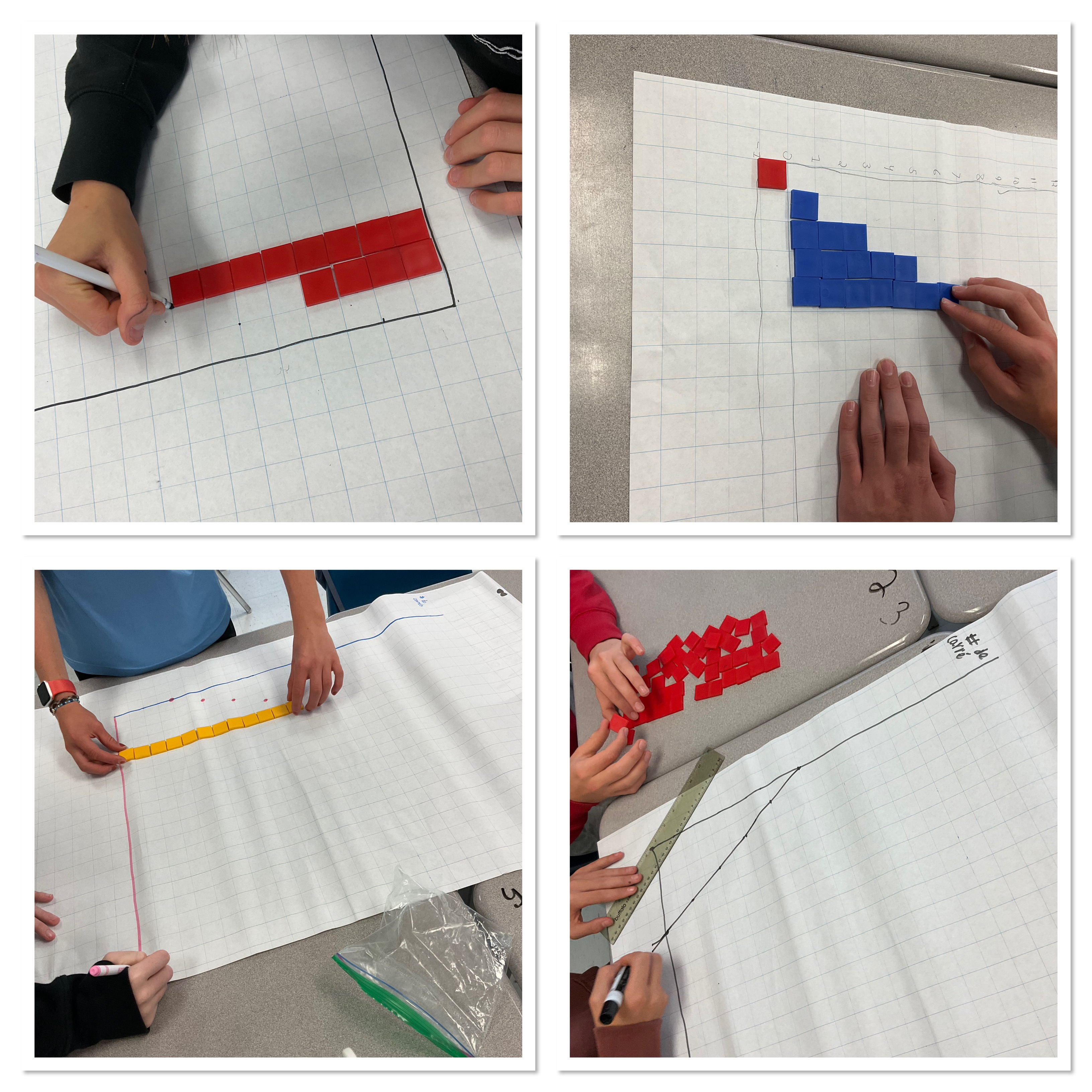 Next groups used 1” grid chart paper with x ans y axes drawn on it. They carefully moved all the tiles from figure 0 into a column on the graph paper that lined up with the y axis. They drew a dot at the top left of their column. The next figure was then dismantled and rebuilt into a column beside figure 0. A dot was placed at the top left. This was repeated until all of their figures had been moved and traced.