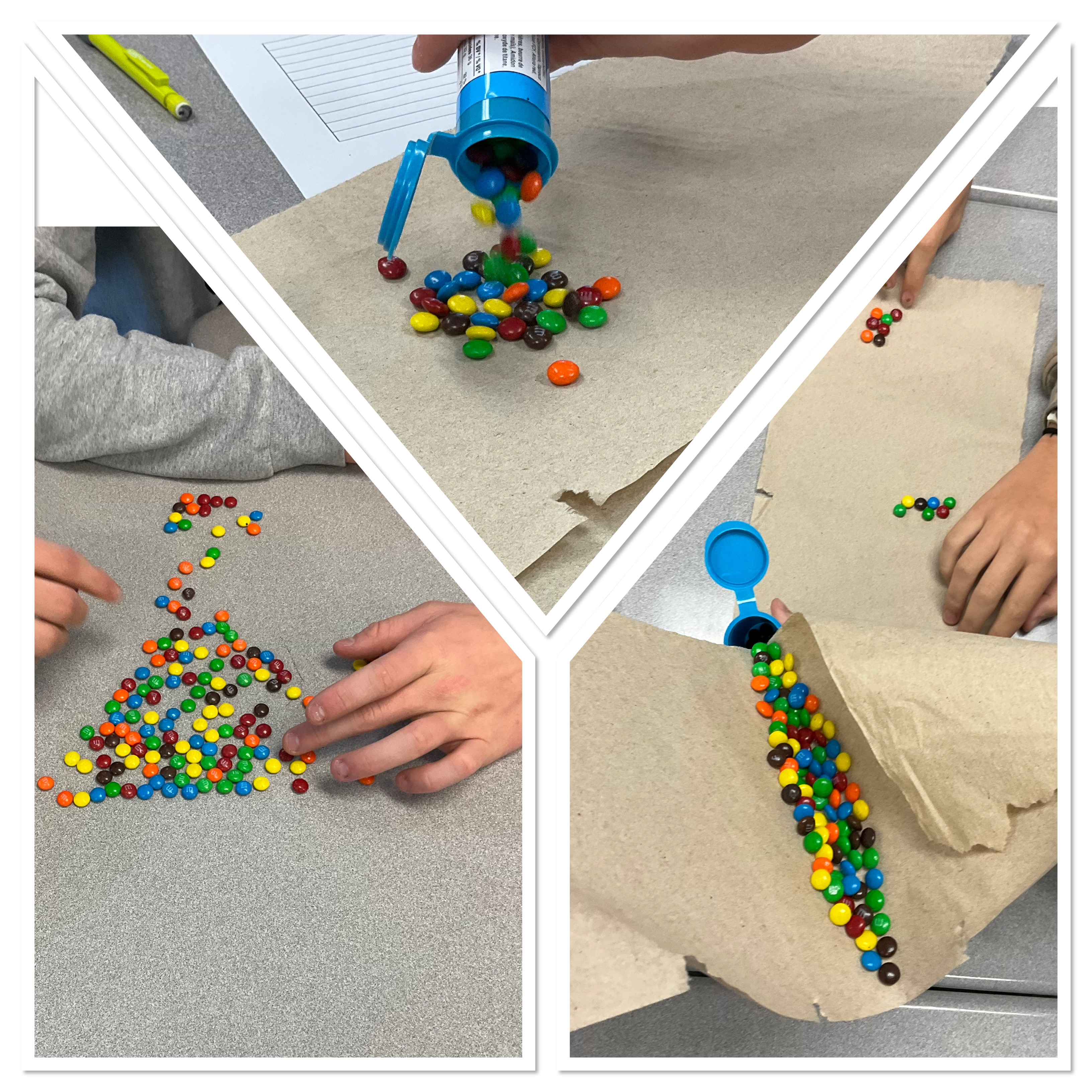 We noticed that the number of m&ms remaining dropped fast at first, and slowed as we continued. Some groups noticed that they had 8-13 remaining, even after repeating the process 15 times. It turns out some m&ms didn’t get printed!