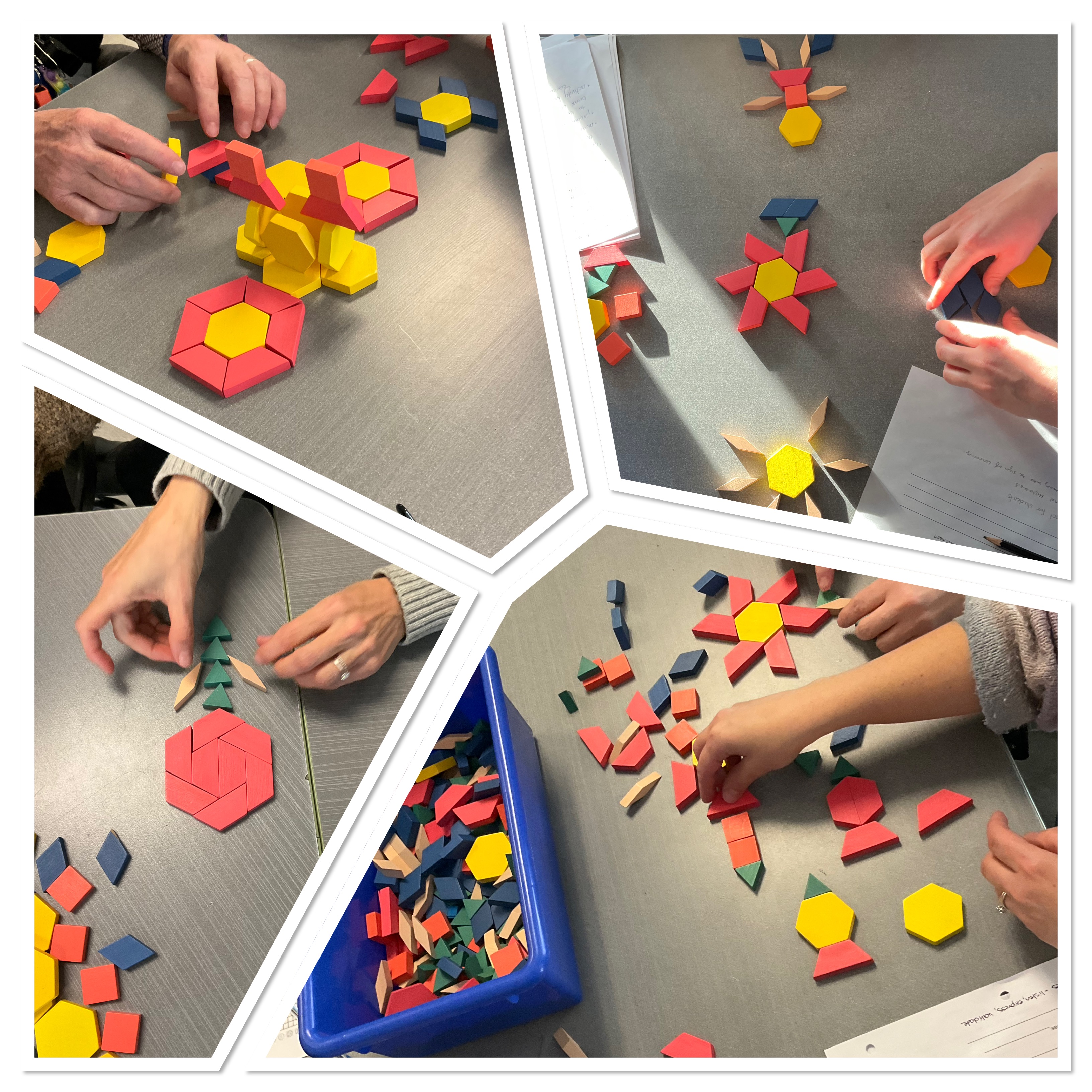 Our next task was to make some art with the patterning blocks. We looked at all the math we could see: rotational symmetry, lines of symmetry, fractions and percent of blocks that are of a certain colour, parallel lines, angles that are complementary, angles inside a polygon, perimeter, area…so many ideas. We also used the first letter of each colour and made an algebraic expression for each picture e.g. 1y+6r+1g+1b=flower