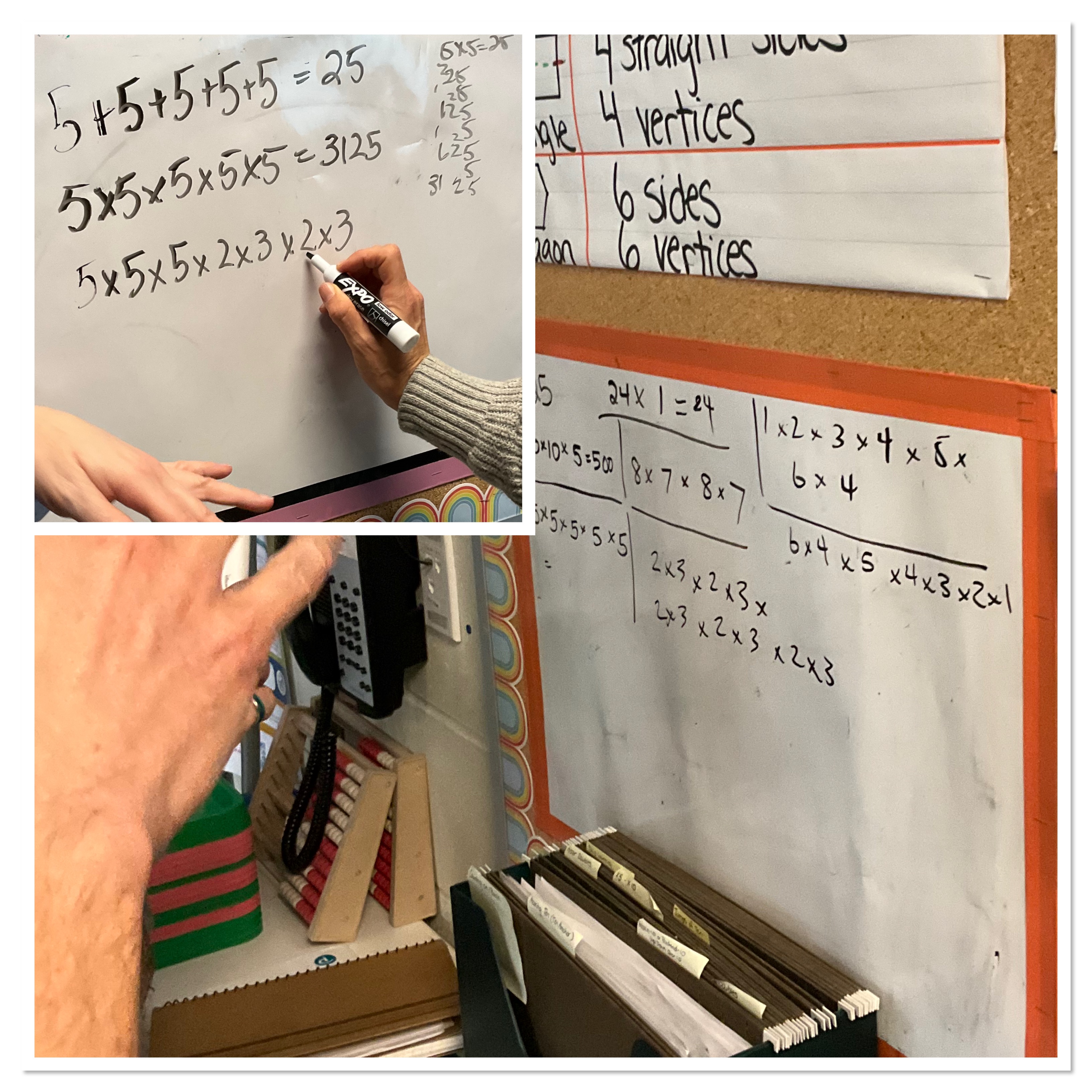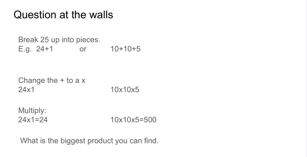 Next we did a thinking classroom style problem at the walls. The prompts were to break up 25 into pieces. All the pieces will add to 25. Next change the addition to multiplication and look for the biggest product.