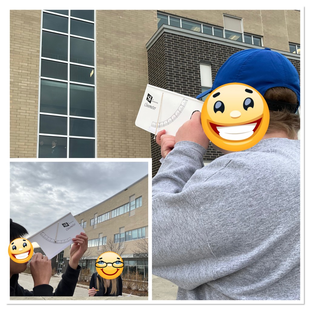 Groups looked through the tube on the clinometer to see the roof of the school. We measured where the string fell which tells us the number of degrees in the angle of elevation.