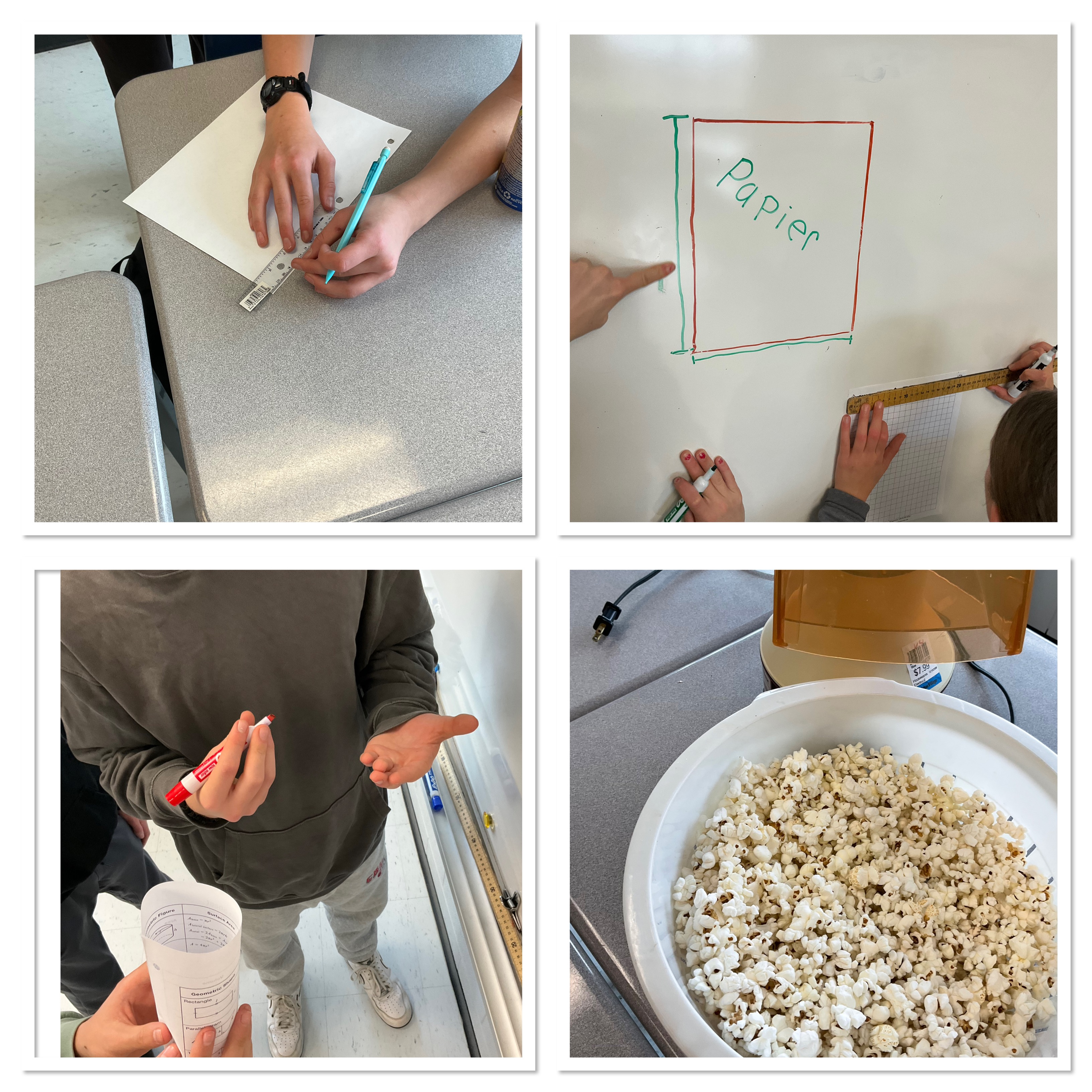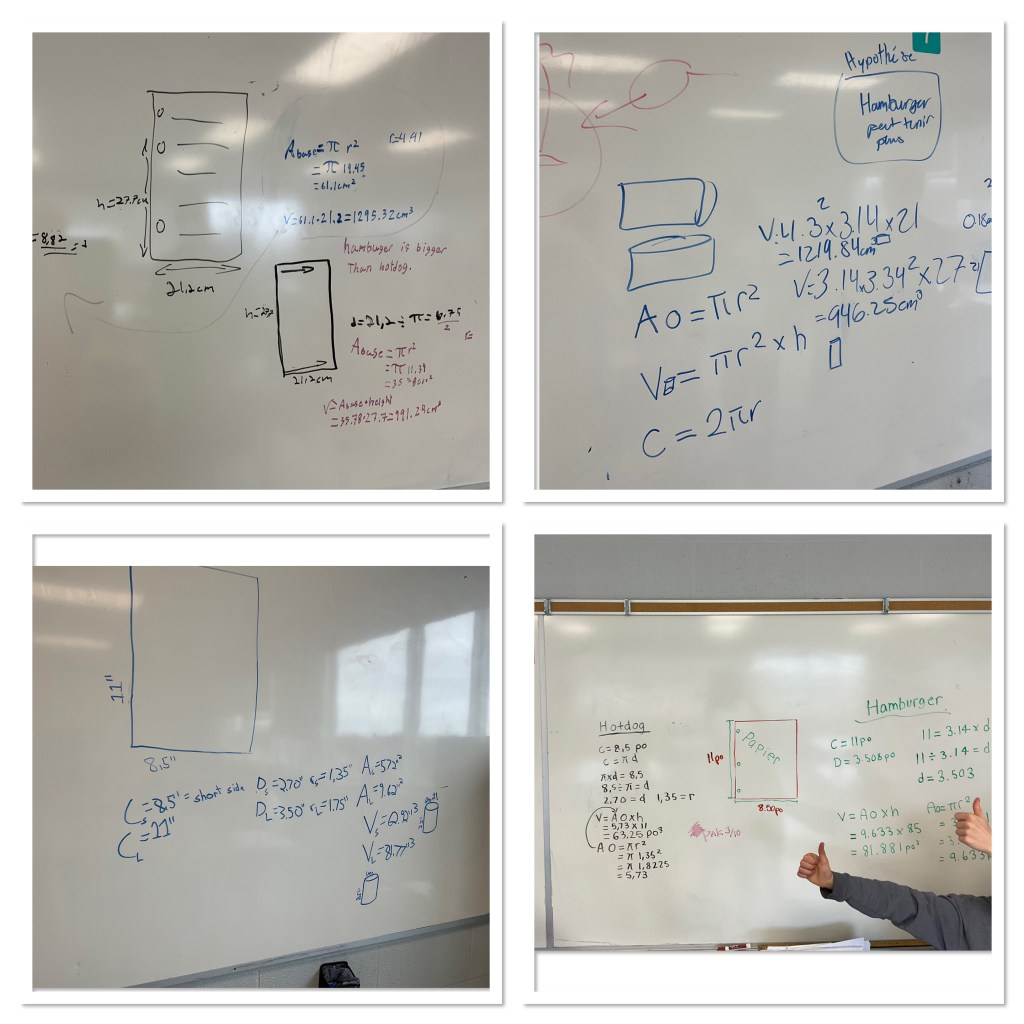 This question was inspired by the popcorn picker 3 act task. I showed act 1 yesterday and asked the class to think about which holds the most popcorn, an 8.5”x11” paper made into a tube in portrait orientation (we called this hotdog) or in landscape orientation (we called this hamburger).