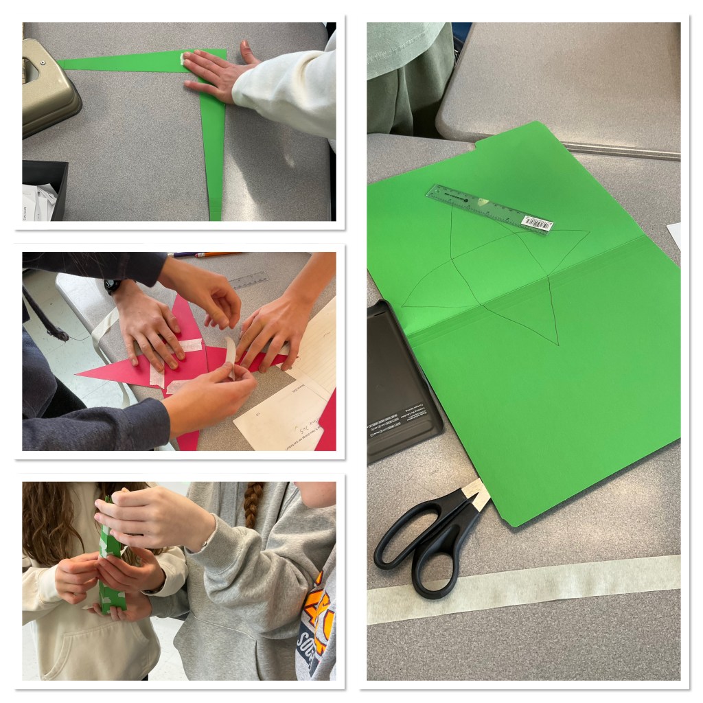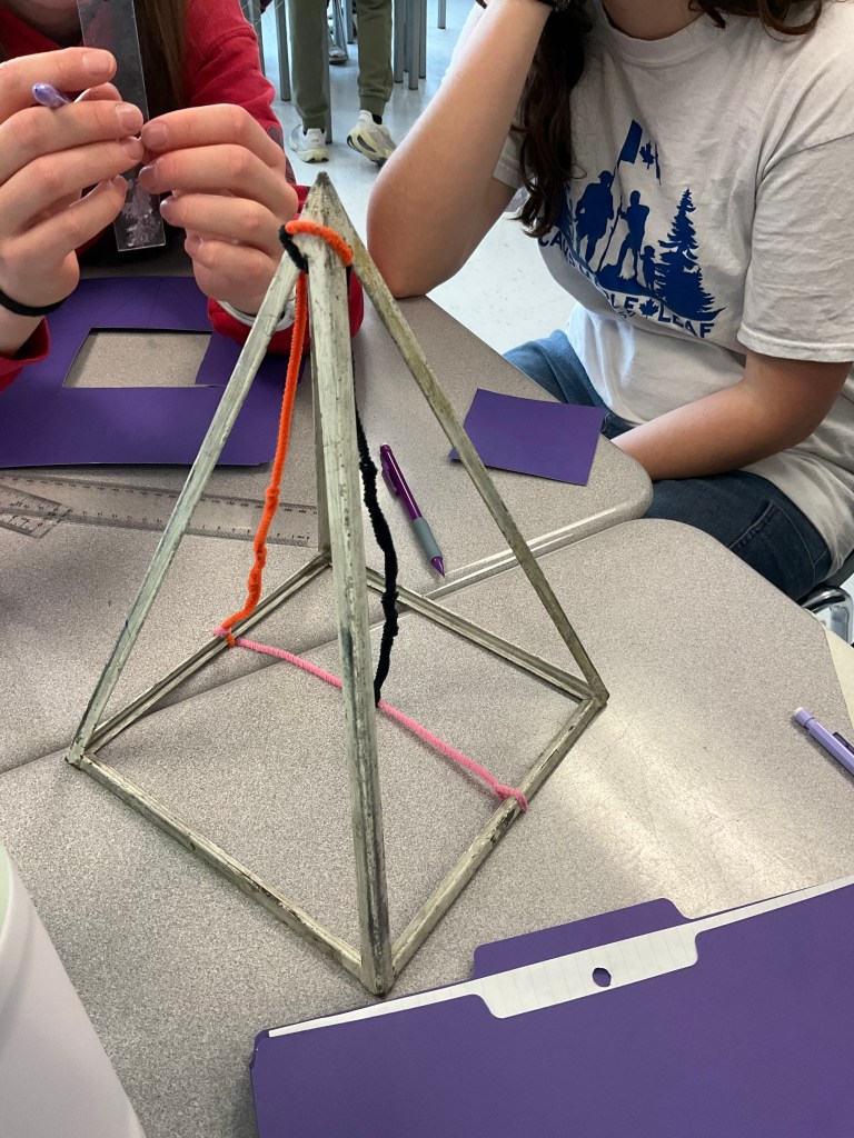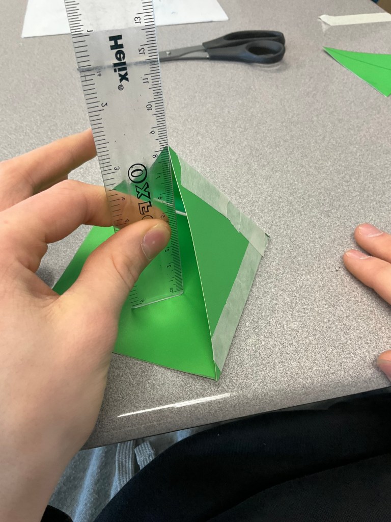 When faced with the fact that many were not tall enough (because usually students do not realize that the slant height and pyramid height are not the same), this class was very resilient and regrouped and made a new plan.