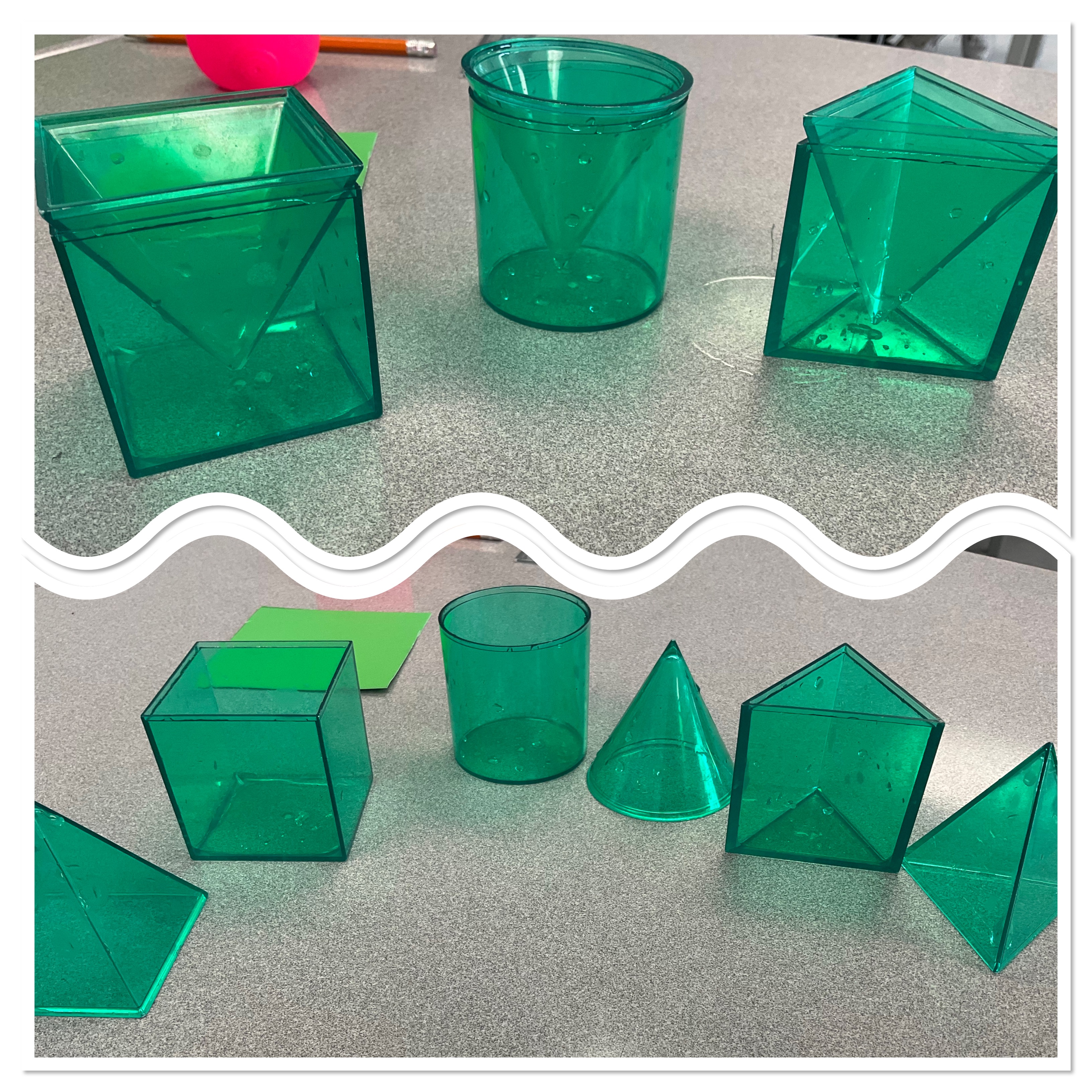 Grade 9s today learned about the volume ratio of pyramids and prisms with the same base and height. We used the 3D solids and poured pyramids full of water one at a time until we filled the prism. Many guessed that the prism is half the volume of the pyramid at first, but after seeing it 3 times realized that the pyramids are always 1/3 the volume of the prism.