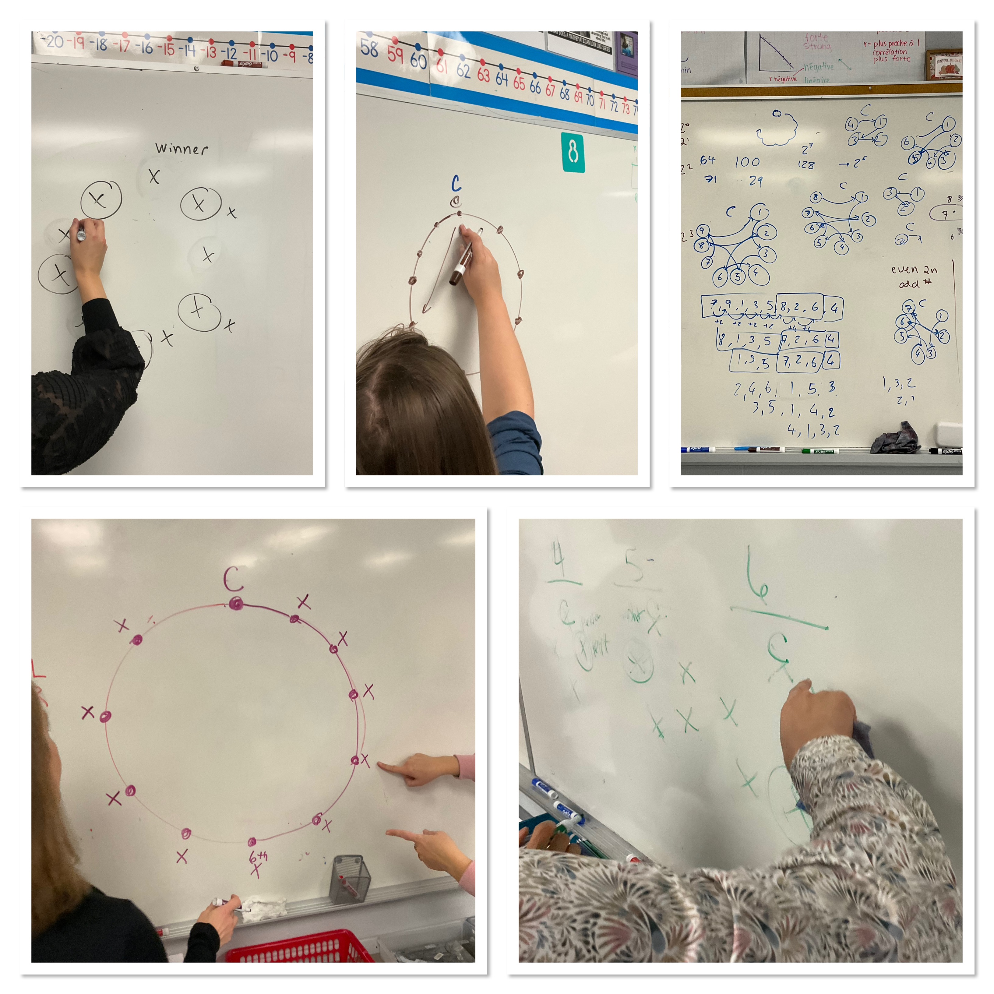 We took time to explore the problem, and figure out how to keep track of our data and how to extend the patterns that we saw. Some groups didn’t want to start with 10 pirates, they started with a smaller case of 4 or 5 or 6, which in this case doesn’t clarify the situation as much as might be hoped. One group started off with a general case of n pirates which is quite an overwhelming task.
