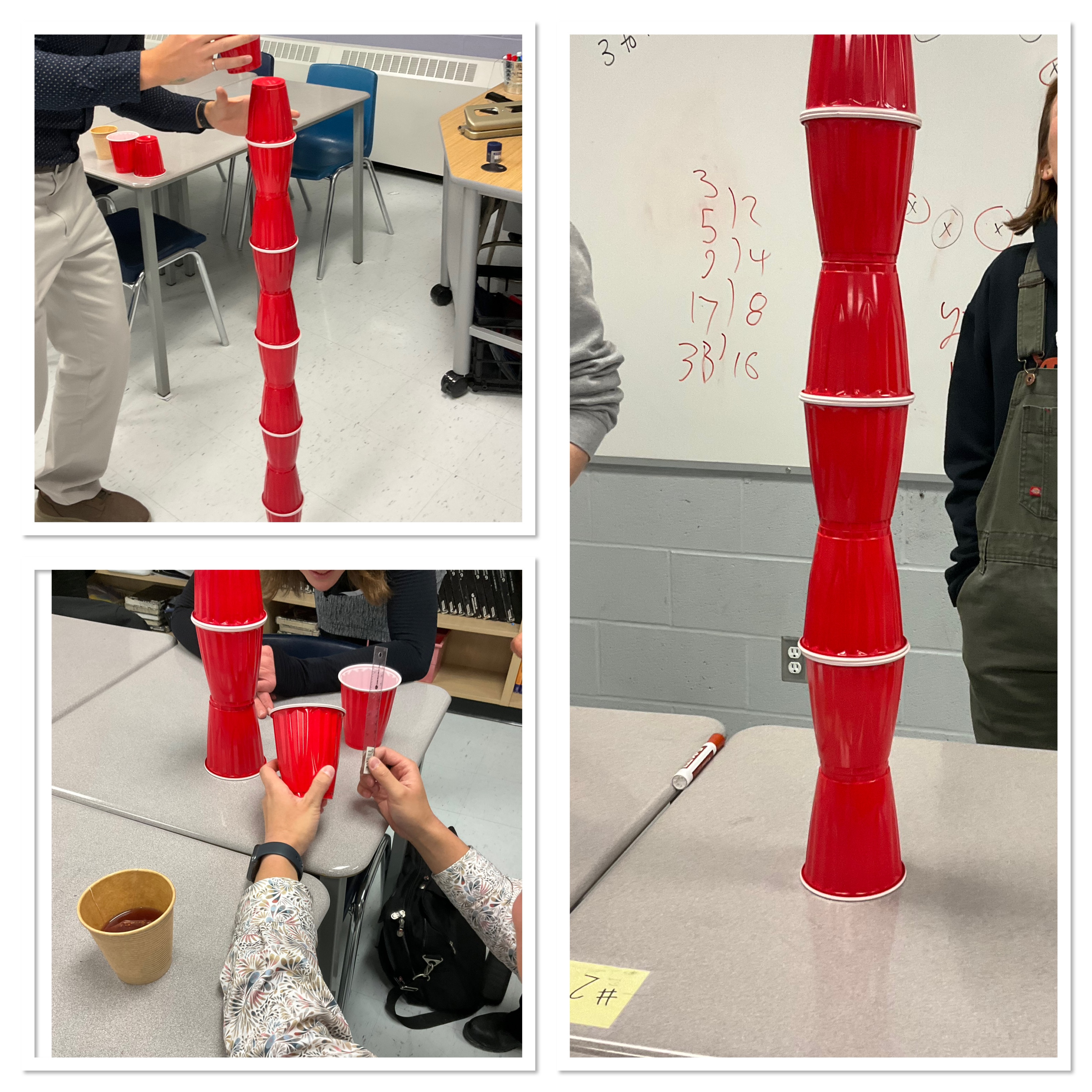 If cups are stacked in a triangle, it’s a quadratic model. Some good prompts would be: “How many cups are needed to make a triangle stack that’s a meter tall?” or “as tall as me?” or “how tall of a triangle stack could you make with 300 cups?”