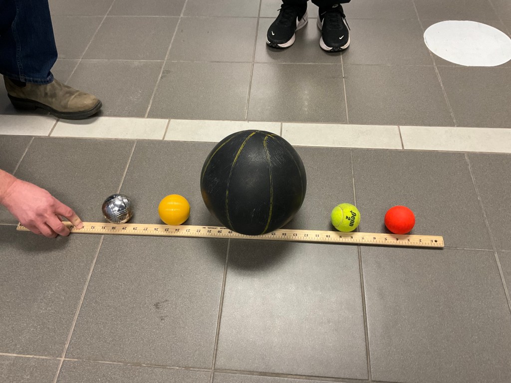 They didn’t roll in straight lines which may impact results slightly. Our order of finishers was: metal bocce, plastic bocce, basketball, ball hockey ball, tennis ball. Nobody in the class guessed the correct order!