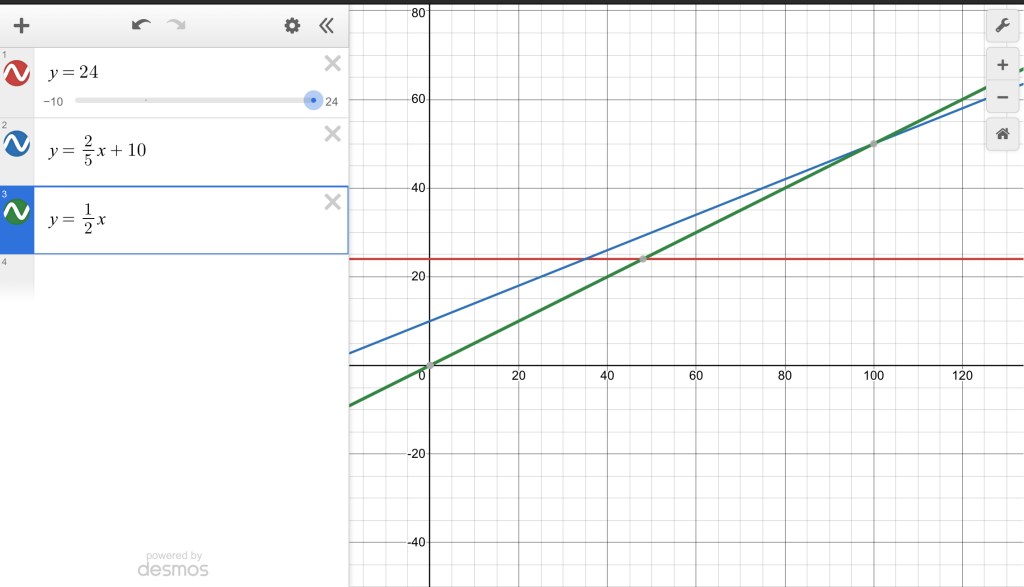 Next we looked at what would happen if Don ate slower, or if Tim had a different head start, and how that would affect the graphs. If 2 ate at the same rate, but one had a head start, they’d never have an intersection because their lines would be parallel etc.