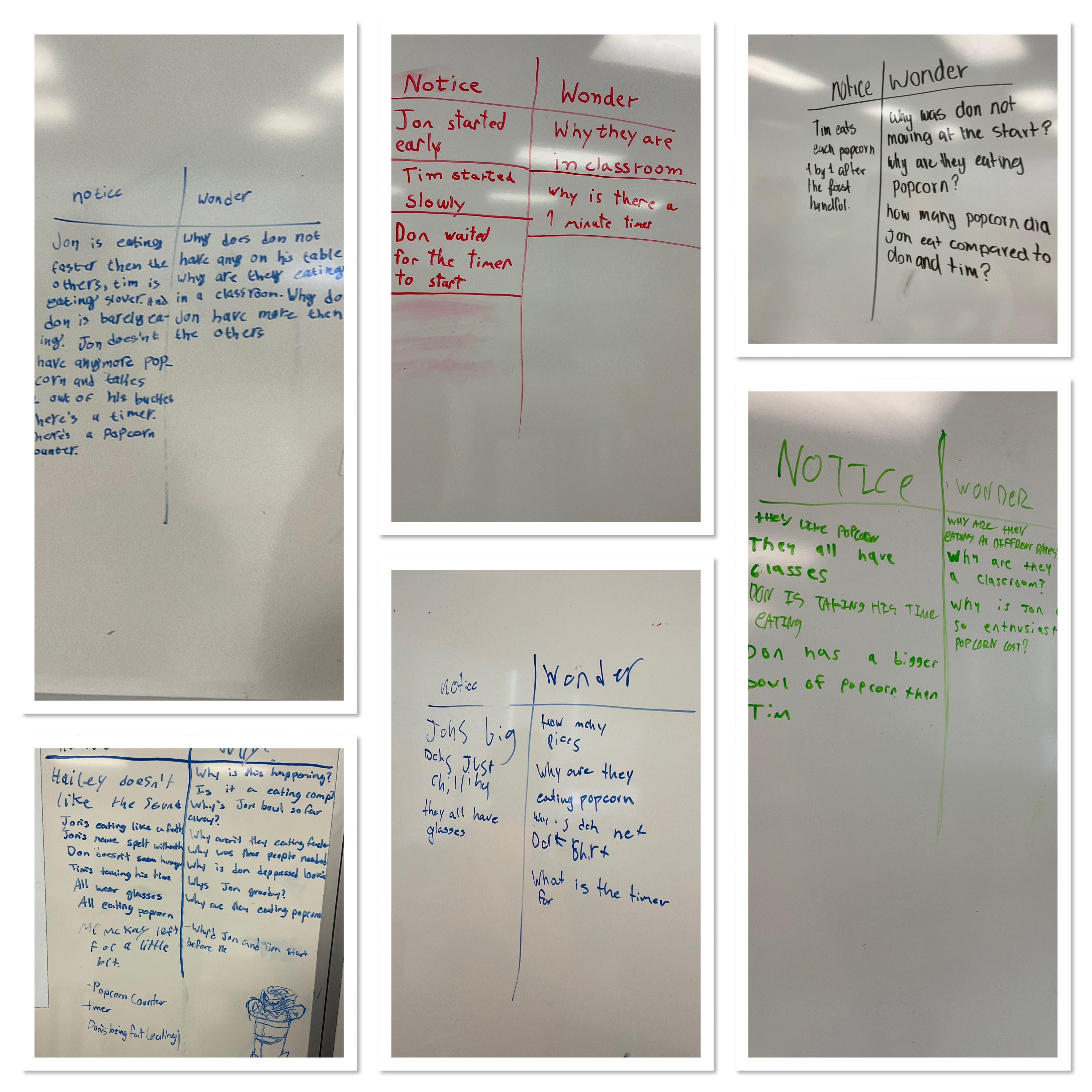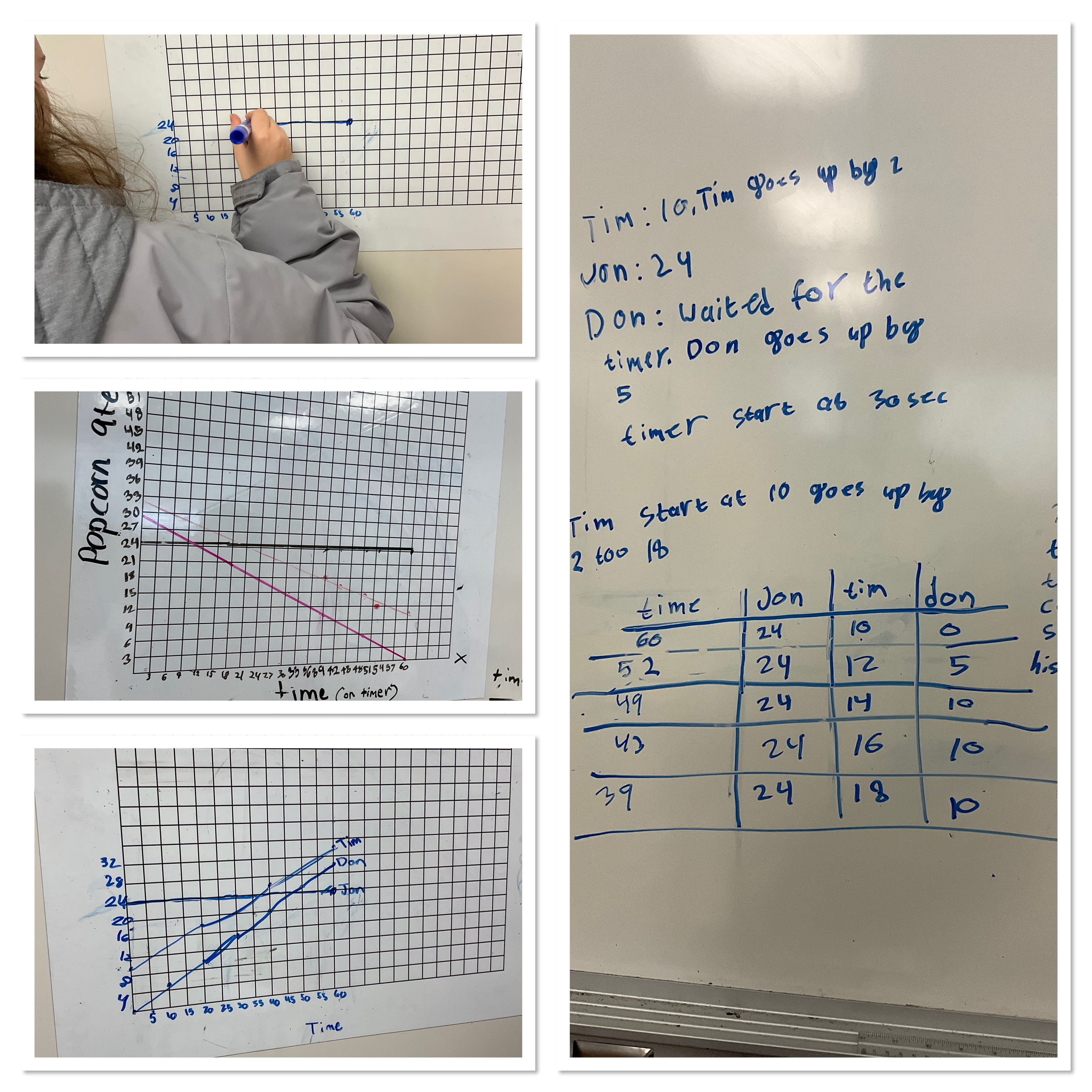 This class had a few different ways to approach time, time elapsed, or time remaining on the counter, so some saw the graphs come together in a different way, looking at what the values of popcorn would be when the timer was at 0 (the y intercept). This is why some groups had negative slopes and some had positive. We didn’t correct/clarify as they worked, because the problem could be solved by either interpretation.