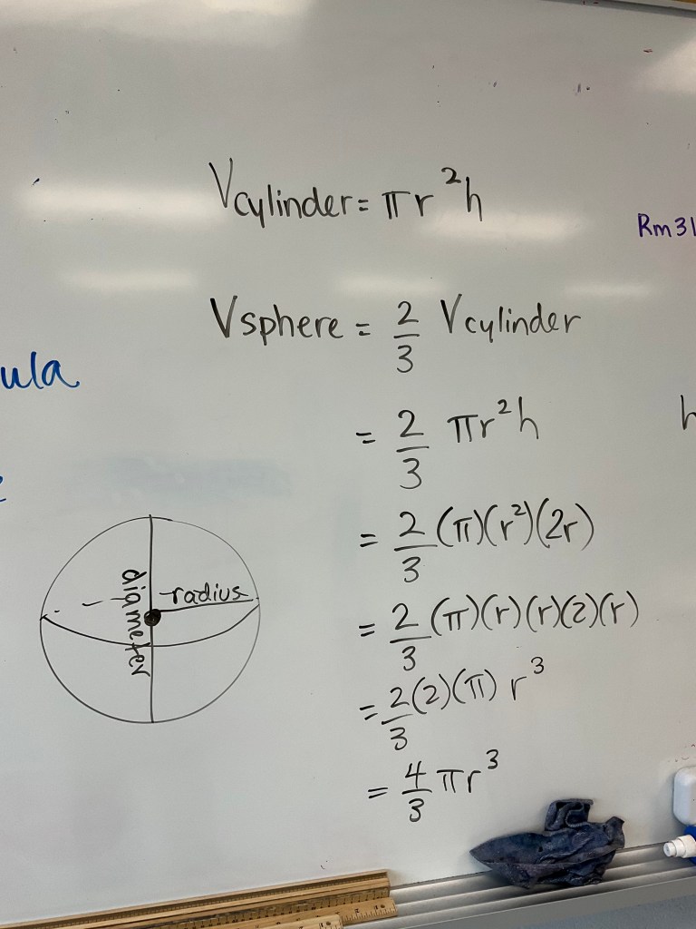 We went through the derivation using some intense algebra and substitution. We needed to substitute thar h=2r, and then we could get the formula for volume of a sphere.