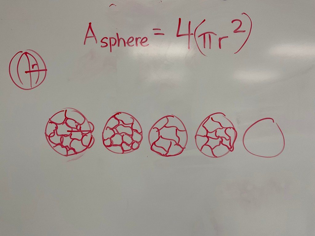 Surface area was next on the list. We used oranges to help us, since they can be peeled. The peel is the surface of the sphere. We drew circles with the same diameter as the orange, then we peeled the orange and fit the peels into the circles.