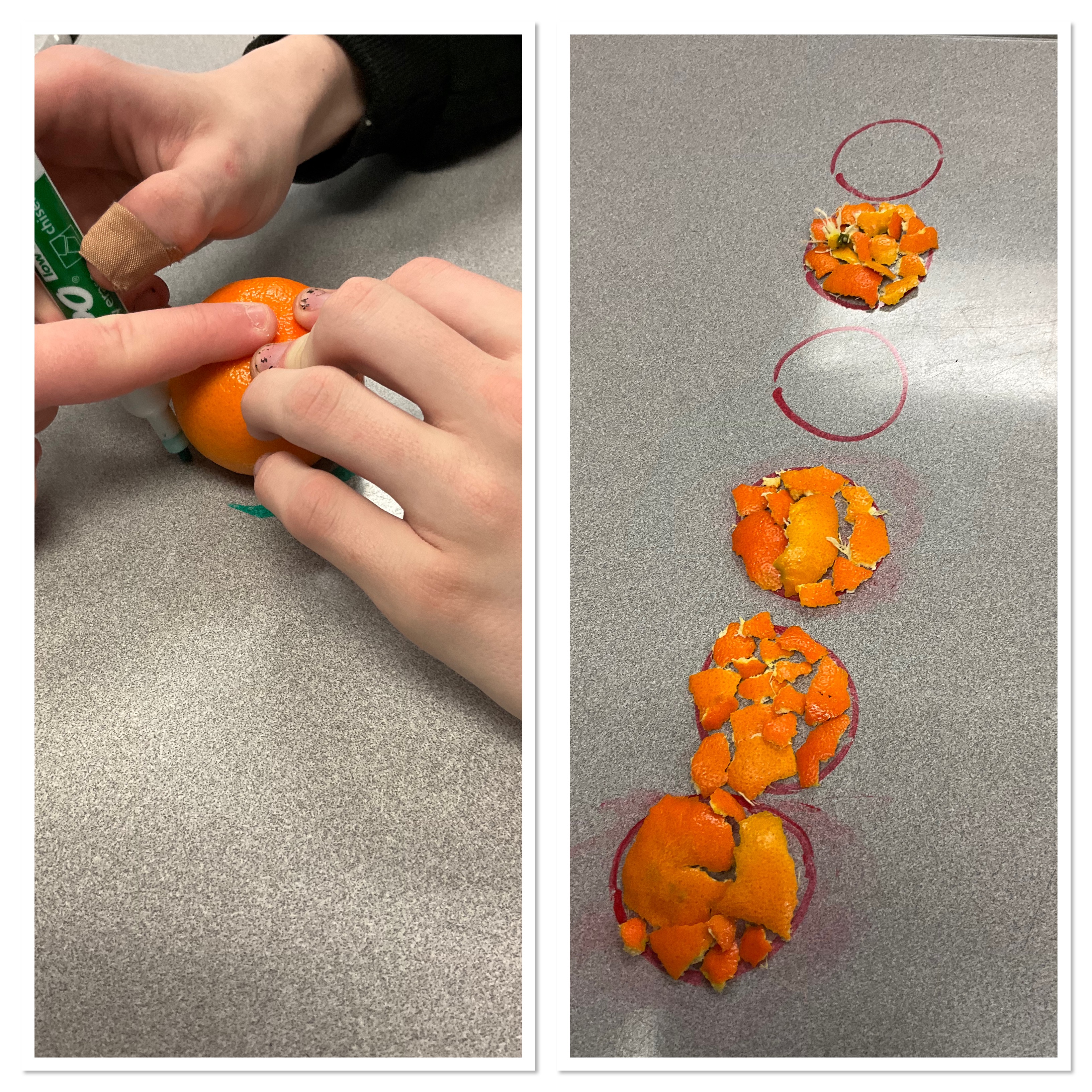 Surface area was next on the list. We used oranges to help us, since they can be peeled. The peel is the surface of the sphere. We drew circles with the same diameter as the orange, then we peeled the orange and fit the peels into the circles.