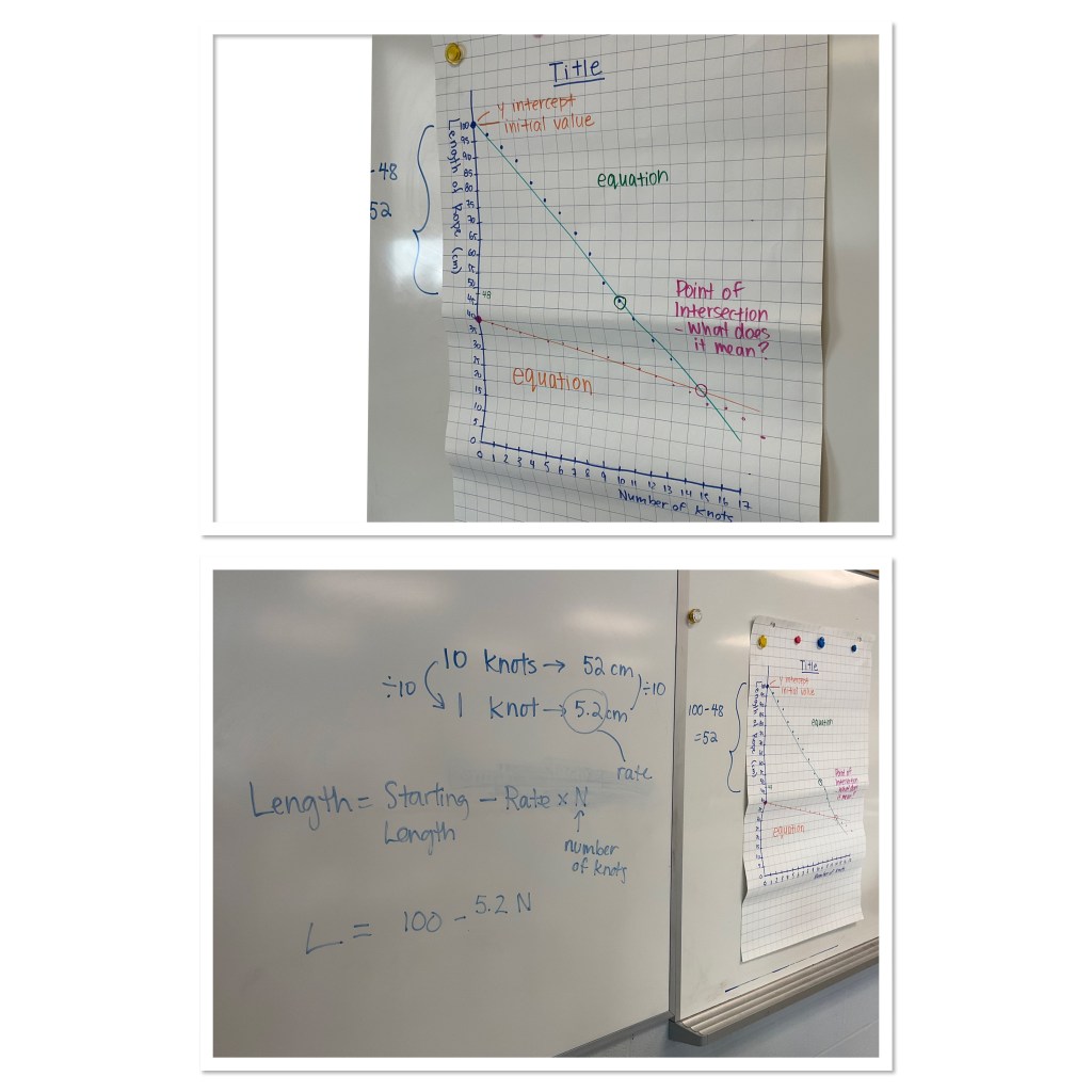 The other task we worked on last week was a knot tying experiment. Today we consolidated that task and worked on graphing, making equations, and interpreting the rate, initial value, and point of intersection.