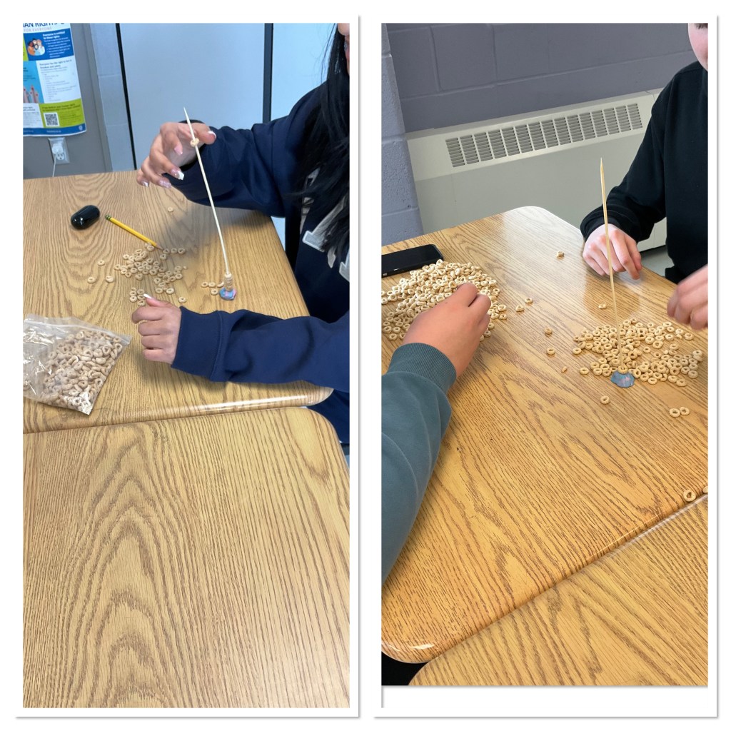 Once we had everyone’s stacking speed data we made a table to show how many Cheerios you’d be able to stack in 2 minutes or 3 minutes based on the initial data. We then made graphs to show both partners data and compare their speeds. (Because so many students had practiced, their speeds that they recorded were pretty close to the same so the graphs didn’t really show major slope differences).