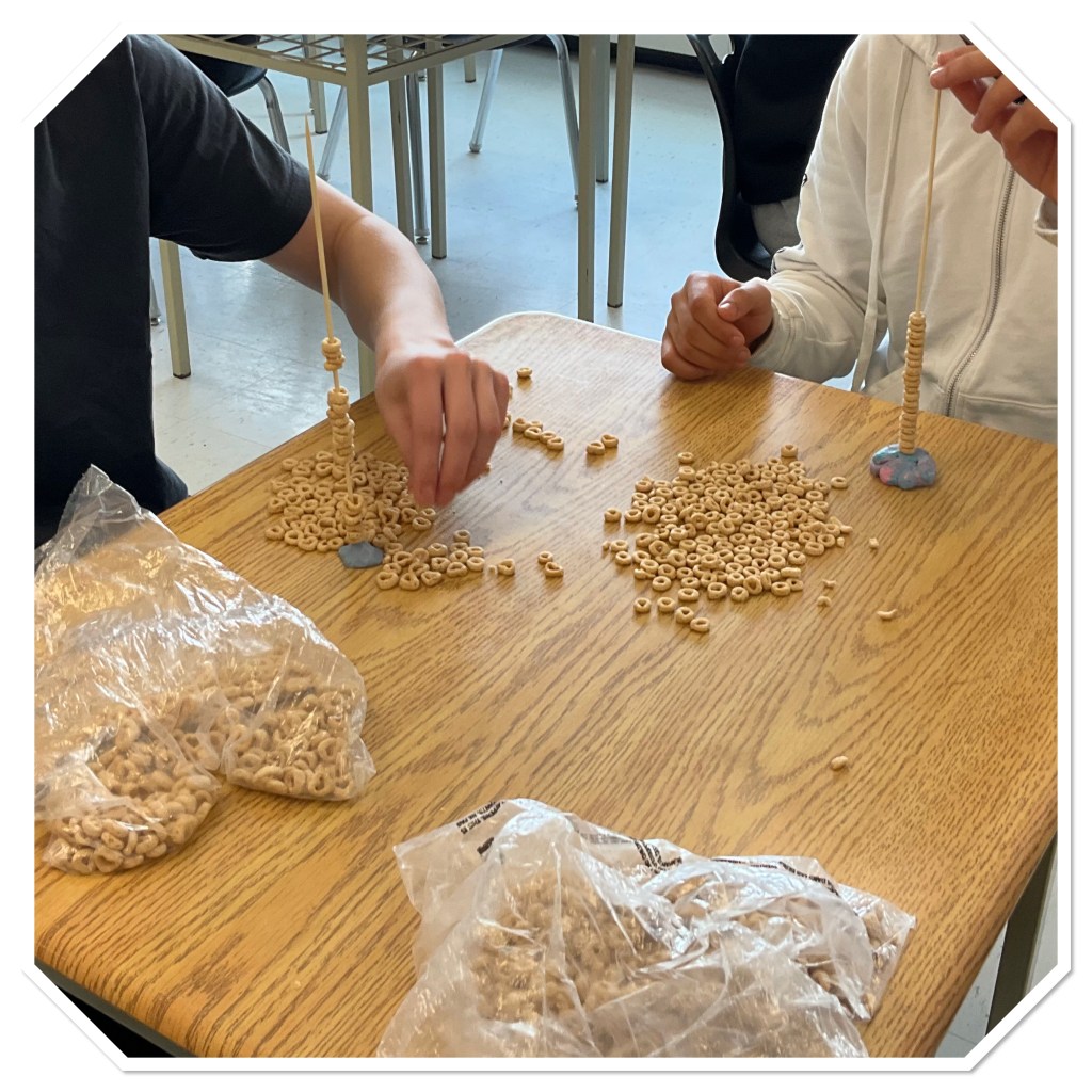 To start with each partnership had 1 skewer and a blob of plasticine to stick it upright on the desk. Each partnership took turns to see how many cheerios they could stack on the skewer in one minute. This established our stacking speed. (If I were to do this again, I’d stipulate that they got one try to do this, and they couldn’t keep redoing it to get a better time)