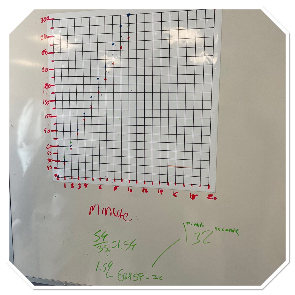 We counted the number of cheerios that could fit on a skewer, then groups used their graphs or their understanding of ratios and proportions, to figure out how many cheerios of head start they’d need. Below are the calculations for the time it’d take for the fastest stacker to fill their skewer. Several students were keen on calculating precisely, in minutes and seconds. It’s great to see their enthusiasm!