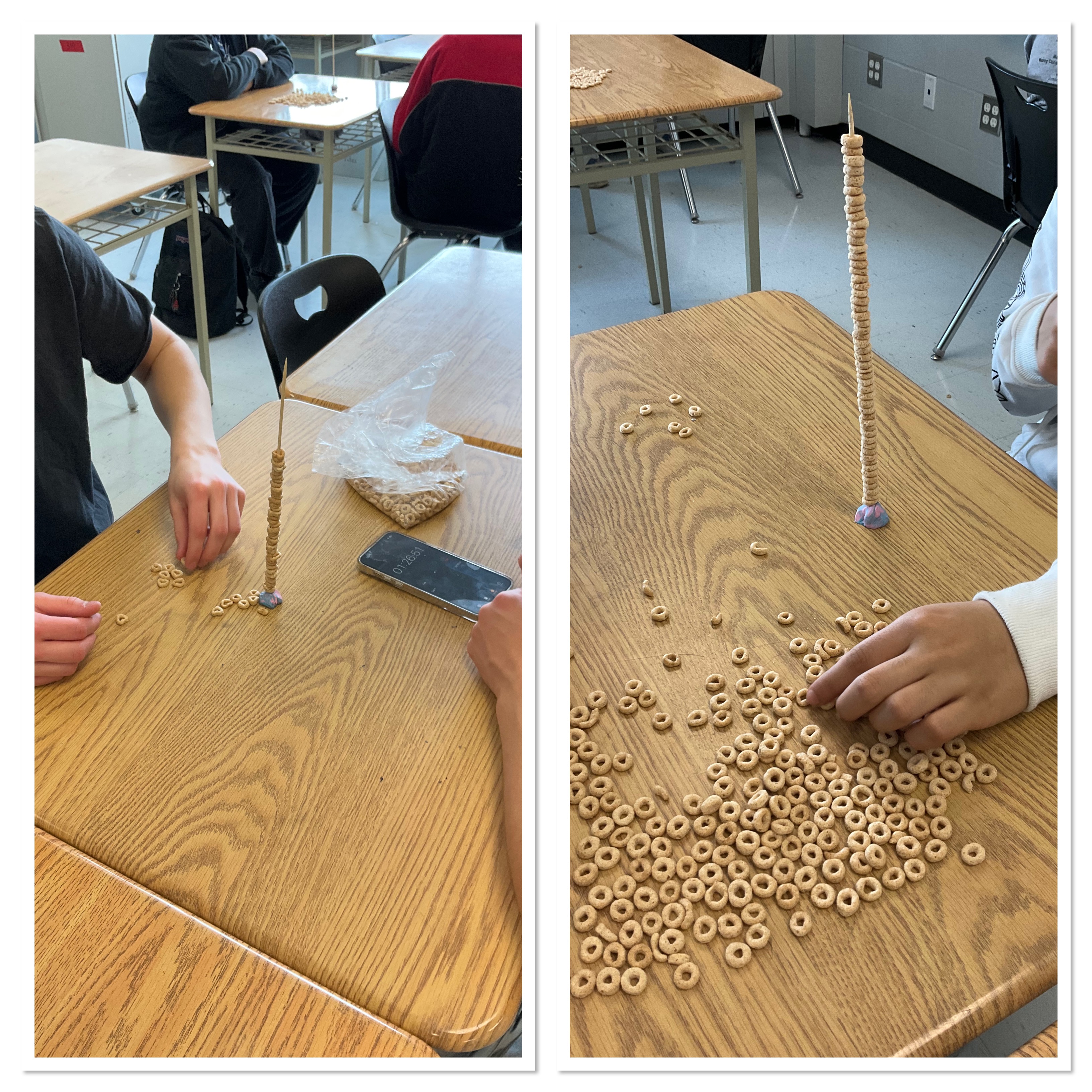 To start with each partnership had 1 skewer and a blob of plasticine to stick it upright on the desk. Each partnership took turns to see how many cheerios they could stack on the skewer in one minute. This established our stacking speed. (If I were to do this again, I’d stipulate that they got one try to do this, and they couldn’t keep redoing it to get a better time)