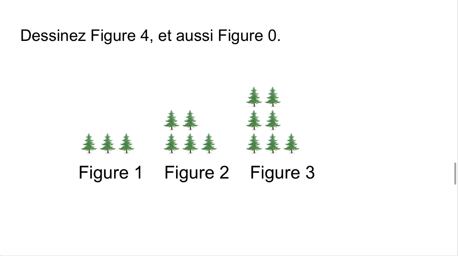 We look at how the tree sequence grows. There are always 2 more each time. We can also see 2 vertical columns of “x” for each figure, and one lonely tree that’s always there (that’s the constant) and it will be the only thing for figure 0. This is the pattern y=2x+1.
