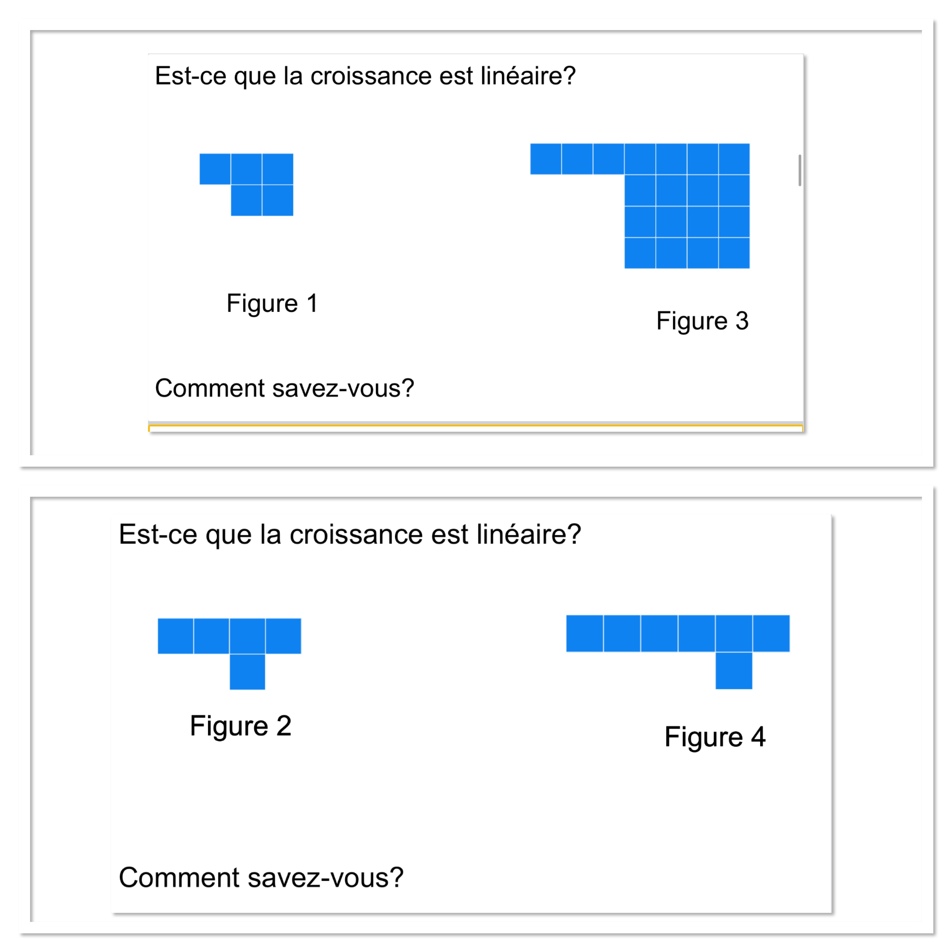Grade 9s are learning about patterning, and linear and non-linear growth. We started by using patterns from visualpatterns.org to explore how something grows.