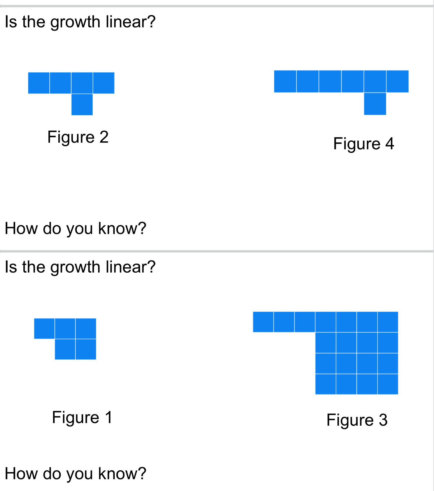 We did a few warm up patterns, and then tried these questions: are the patterns growing linearly or not.