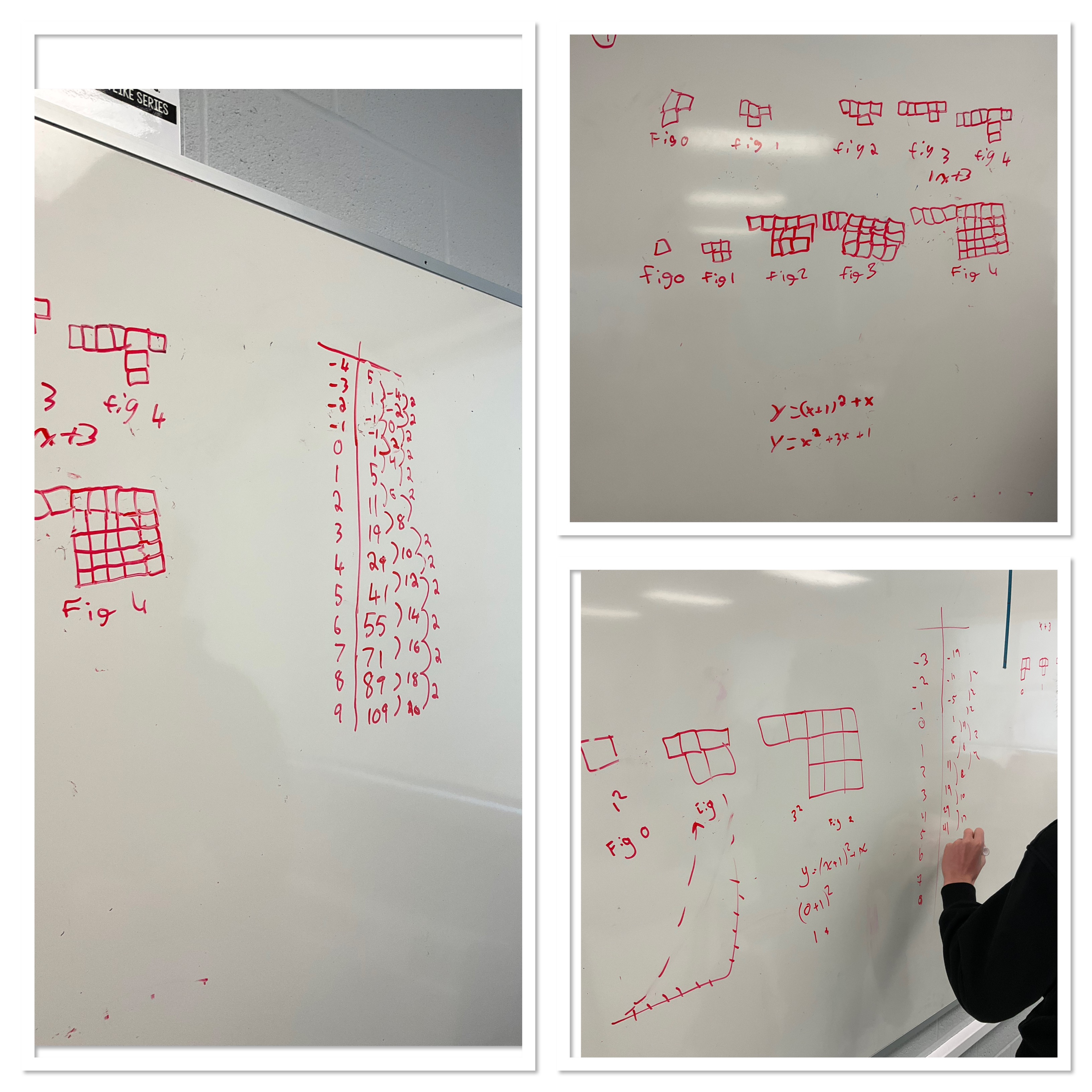 Groups got into exploring the tables to see what happened when the x values are negative. They used their 2nd differences to help fill it in, or used their equations to calculate the y values for negative x.