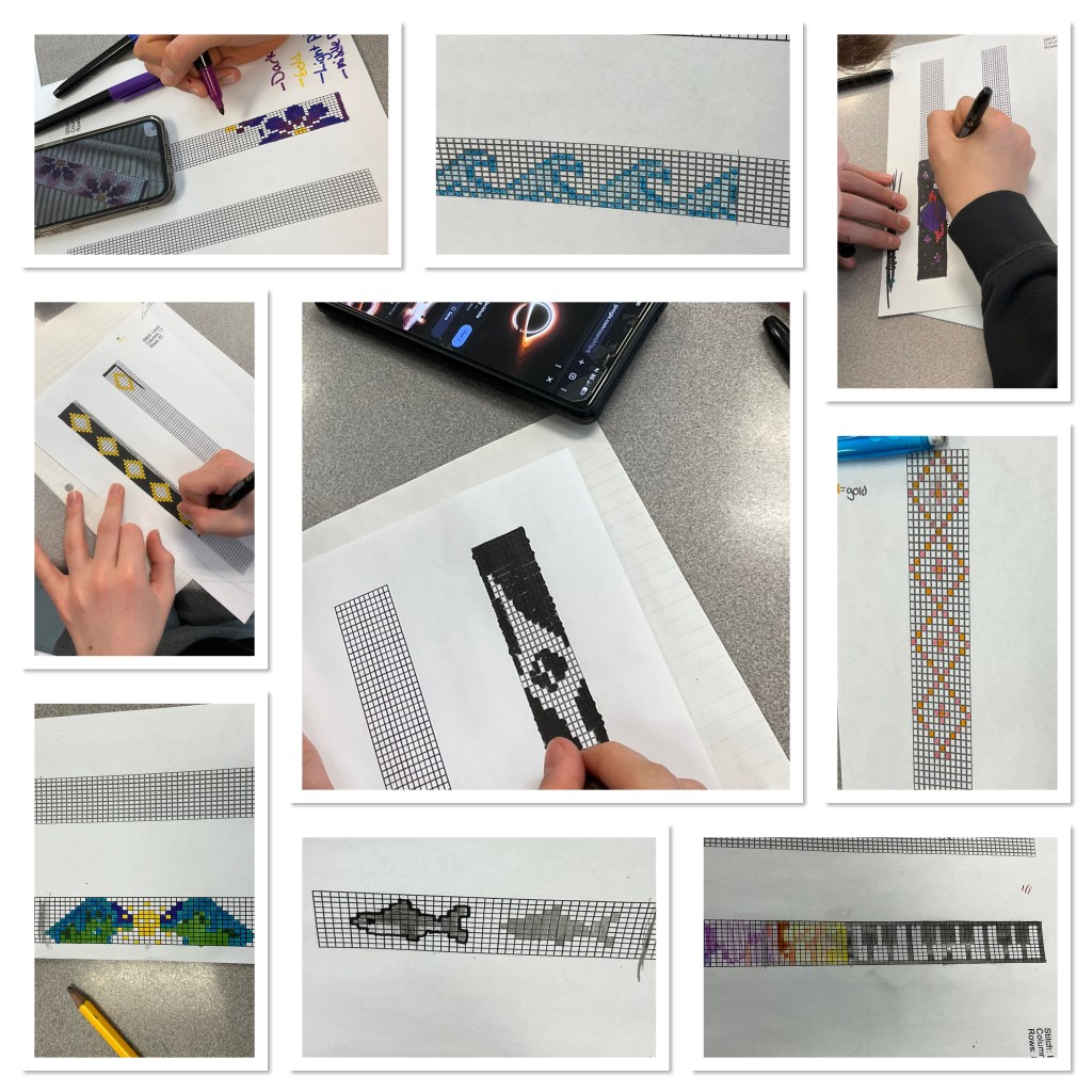 Grade 9s learned about loom beading today from a member of the Indigenous program team at the school board. We have a project we are working on this week: to learn about patterning, symmetry, ratio, percent and area while designing a beaded bracelet or key chain.