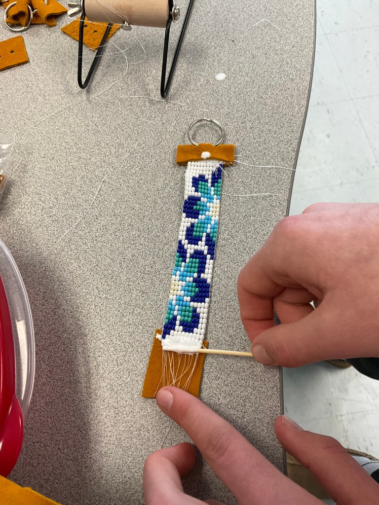 Then we cut the work from the loom and used leather glue to glue the hide to the ends to finish the keychain.