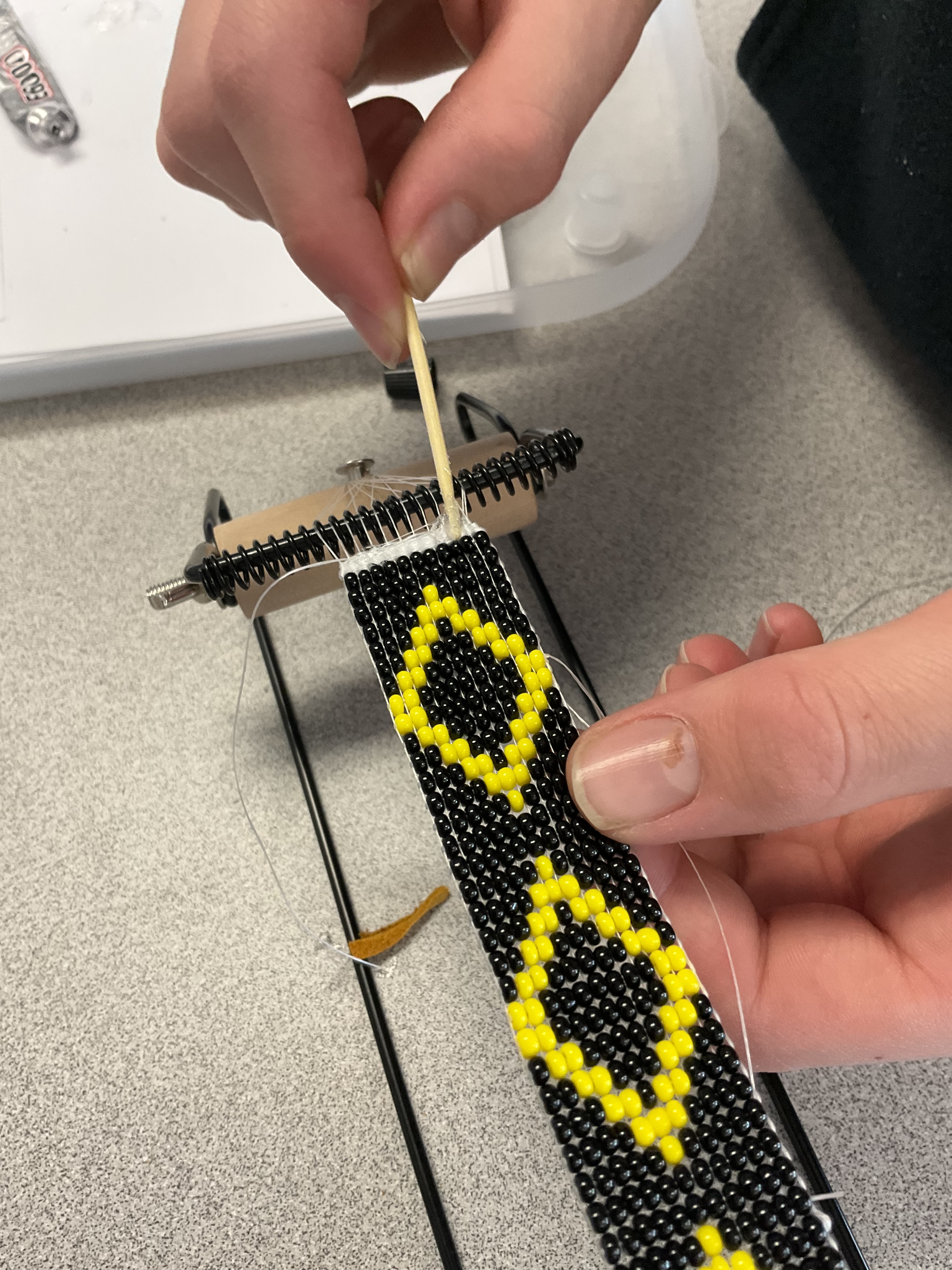 The final steps of the beading involve weaving threads to create a tab of fabric to glue the finishing leather to.