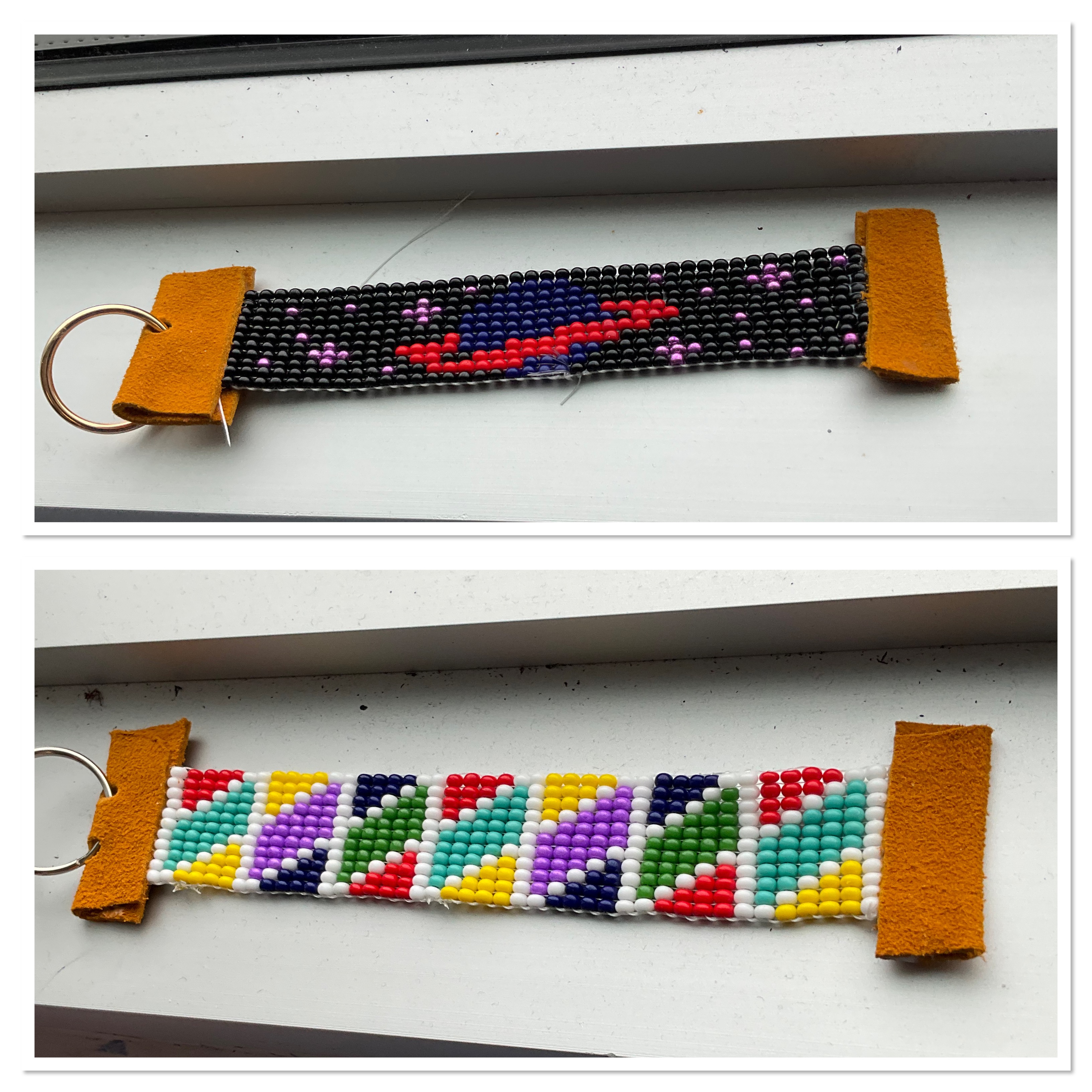 Then we cut the work from the loom and used leather glue to glue the hide to the ends to finish the keychain.