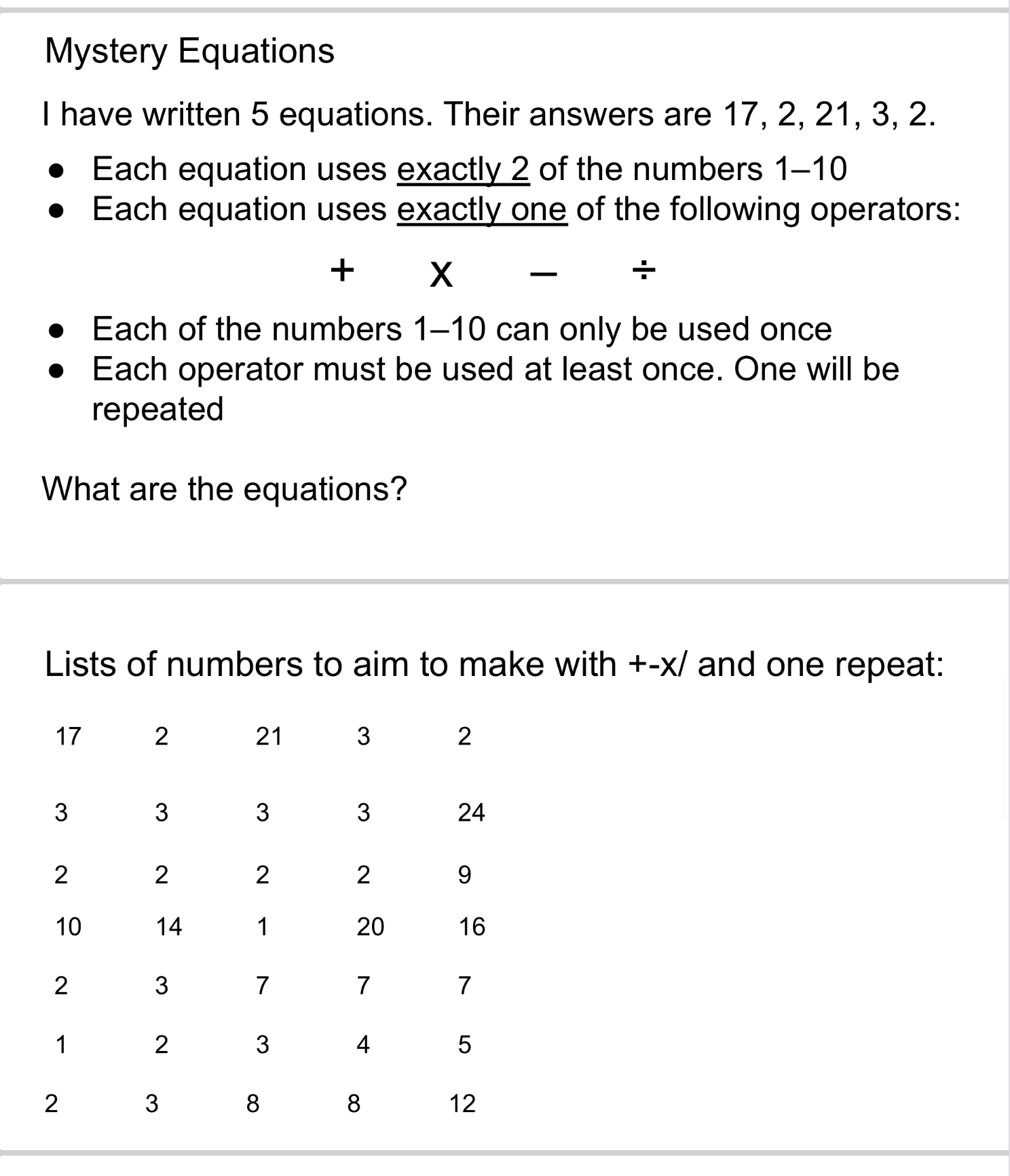 The lesson sequence is from Peter Liljedahl. I didn’t post anything, but said it all out loud. Groups are given the answers to 5 equations, and they need to make the equations to follow the rules. Once a group was done with one set of numbers, I came around to check, and then give them the next set to work on. (See below)