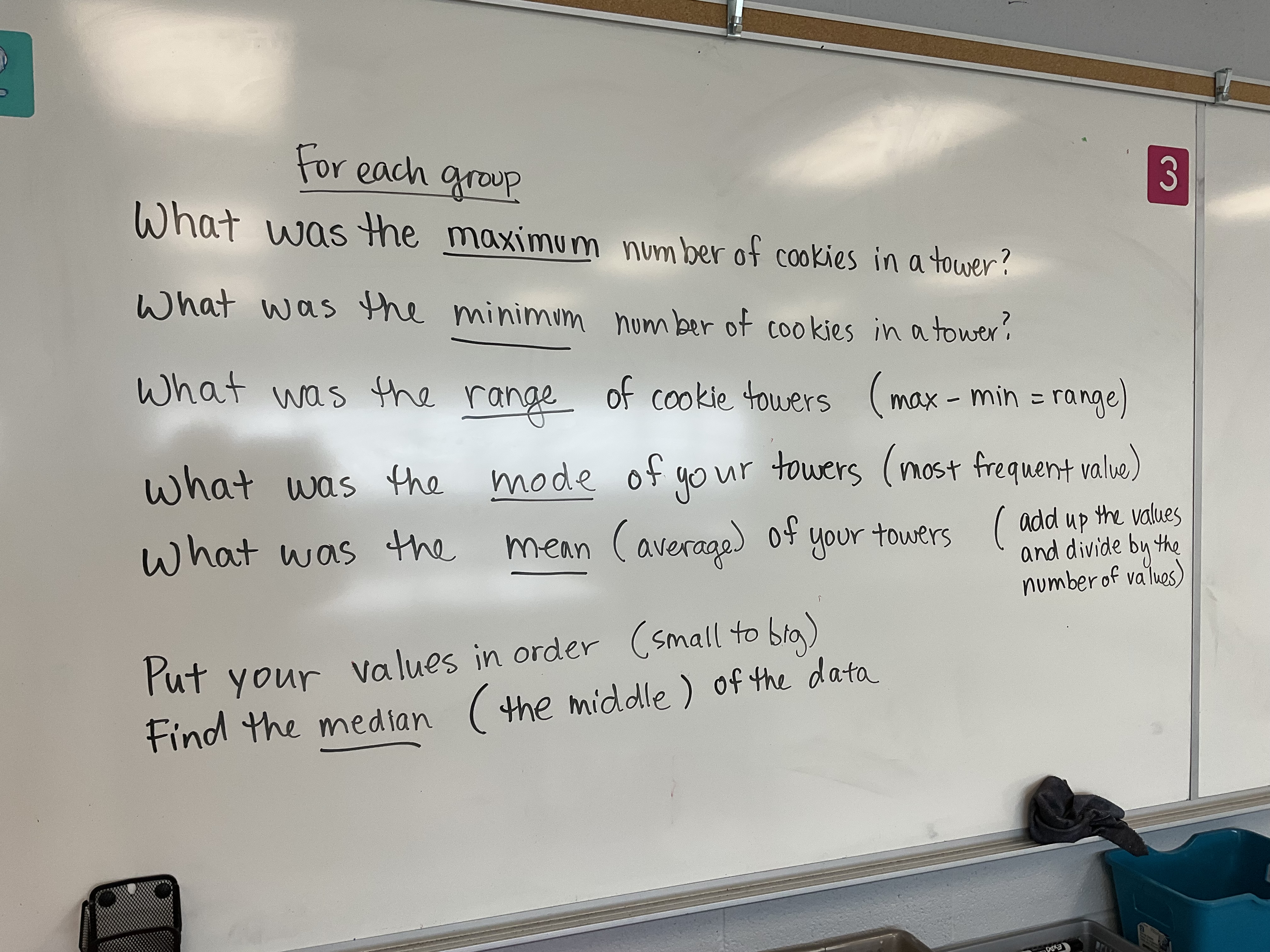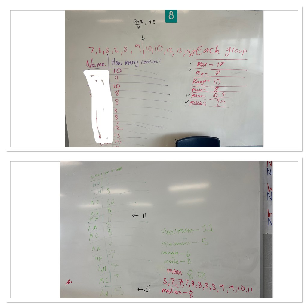 Groups had their data tables complete, then we had to decide who wins. Each group found their max, min, range, mode, mean, and median.