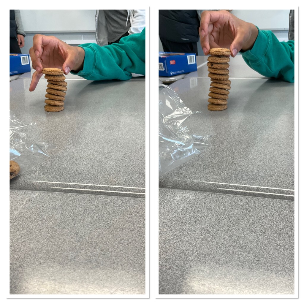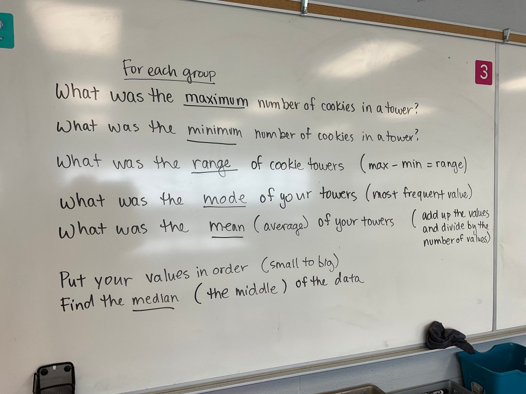 I love to get kids hooked on data collection, and what’s more fun than a cookie tower competition?! We made rules of stacking one cookie on another, one at a time, using one hand only. Each group members took turns stacking towers until we had 12 data points in their charts.