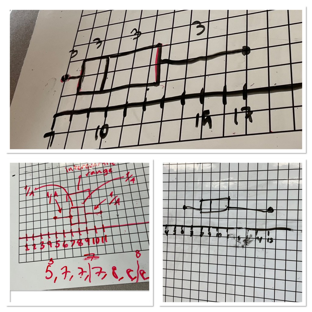 I was working with a colleague’s grade 9 class today, and the goal was to recall mean median mode and range, and to start looking at box and whisker plots.