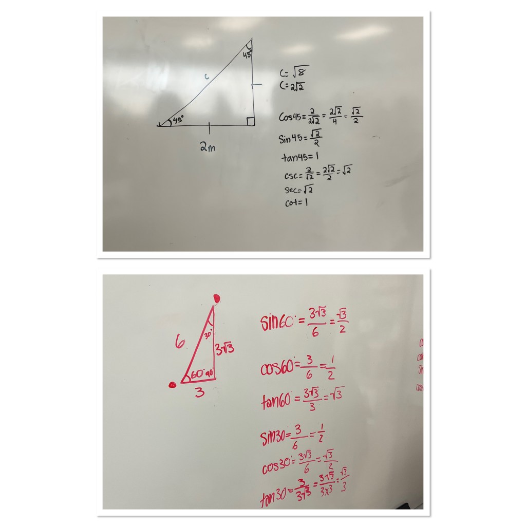 We did the same with an equilateral triangle, sliced in half to create a 30, 60, 90 triangle. We calculated the height of the triangle, and then wrote out all of the simplified trig ratios for each acute angle.