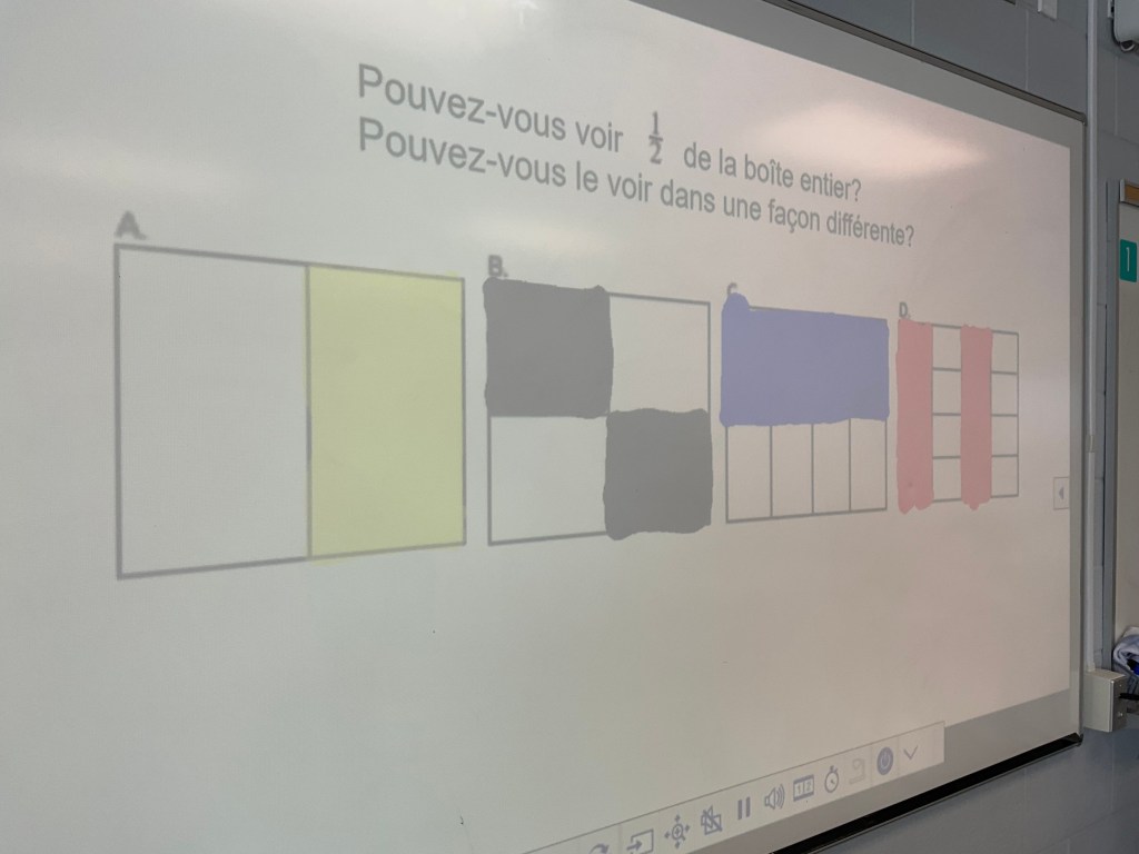 Today in grade 9 we had a look at some fraction fluency. We practiced counting by “one eighths” and we clapped when we got to a whole number. We also worked on representing fractions, and what the numerators (parts) and denominators (total number of pieces) mean. We coloured in 1/2 in multiple ways. We know that 2/4=1/2 and 4/8=1/2 and 8/16=1/2.