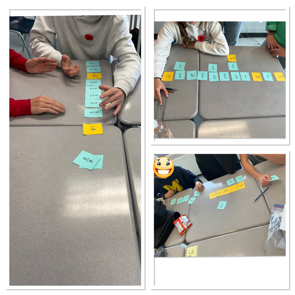 Next our challenge was a card sorting task as a class. In 3 small groups students sorted through cards with fractions or decimal values on them. Each group ordered their stack of cards. We had some interesting conversations about equivalent expressions, or improper fractions and mixed numbers, or what does 0.3 with the line mean compared to 0.3 without a line over the 3.