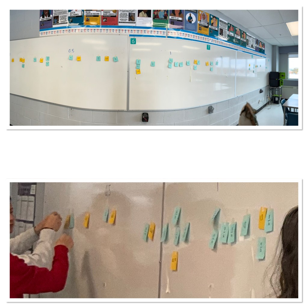 Each group chose someone to take the smallest value that they had over to one side of the whiteboard, and another volunteer to take their largest value to the other side of the whiteboard. They had a chat to decide on the smallest and largest values in the room. We then had the edges of our number line, and worked together as a class to put all of the values in order.