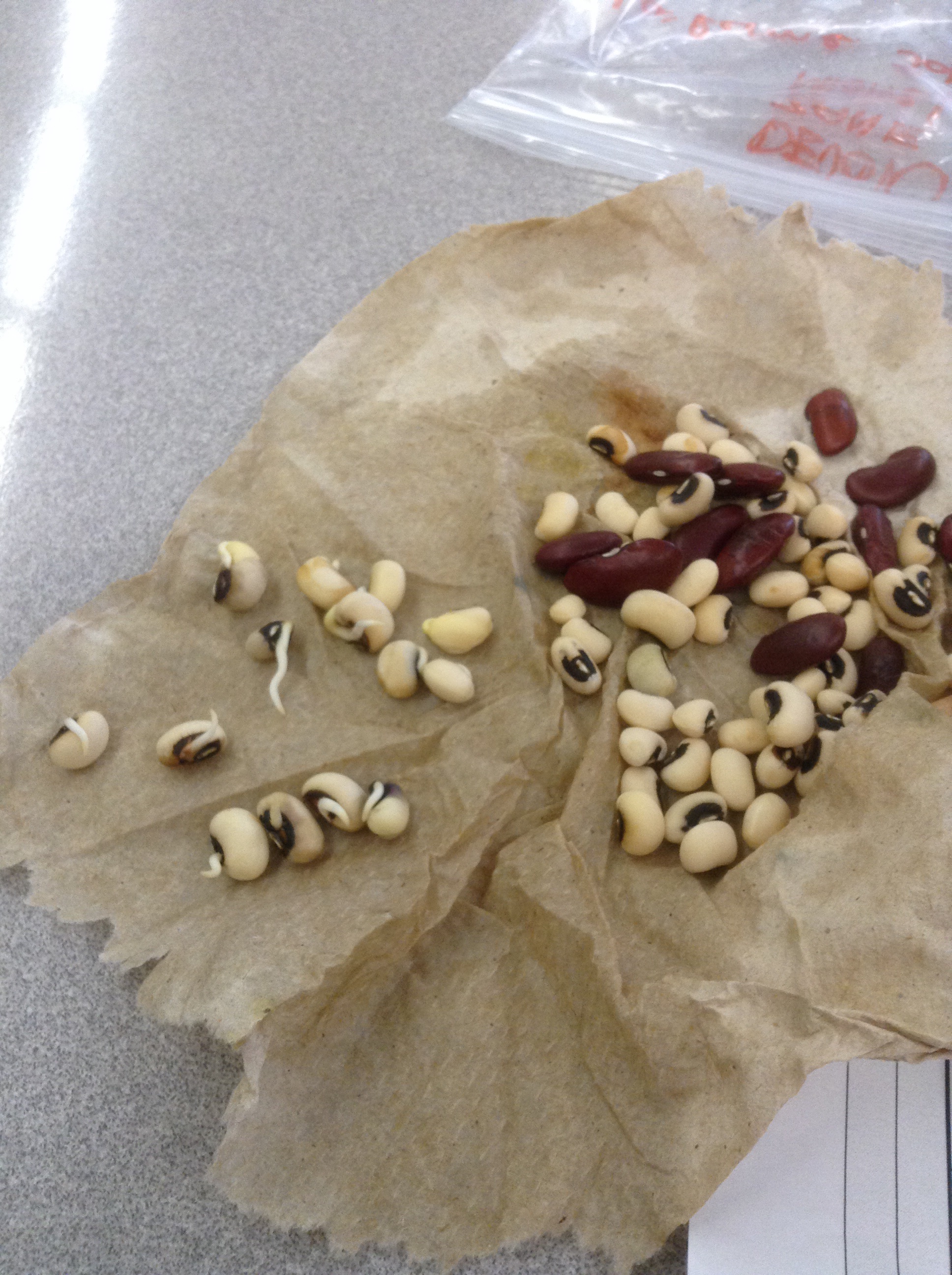 We counted out the beans, wrapped them in paper towel, put them in water, then sealed them in a sandwich bag and put them on the window ledge. We will check them daily.